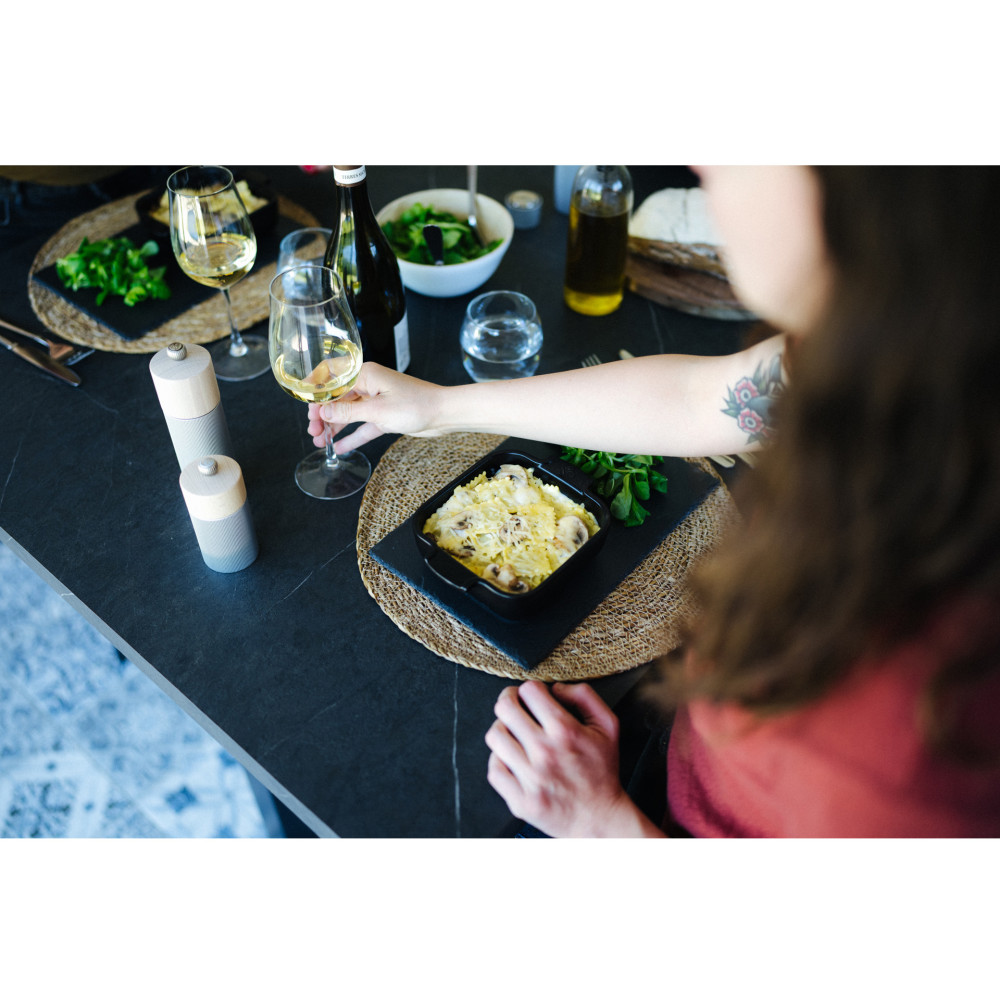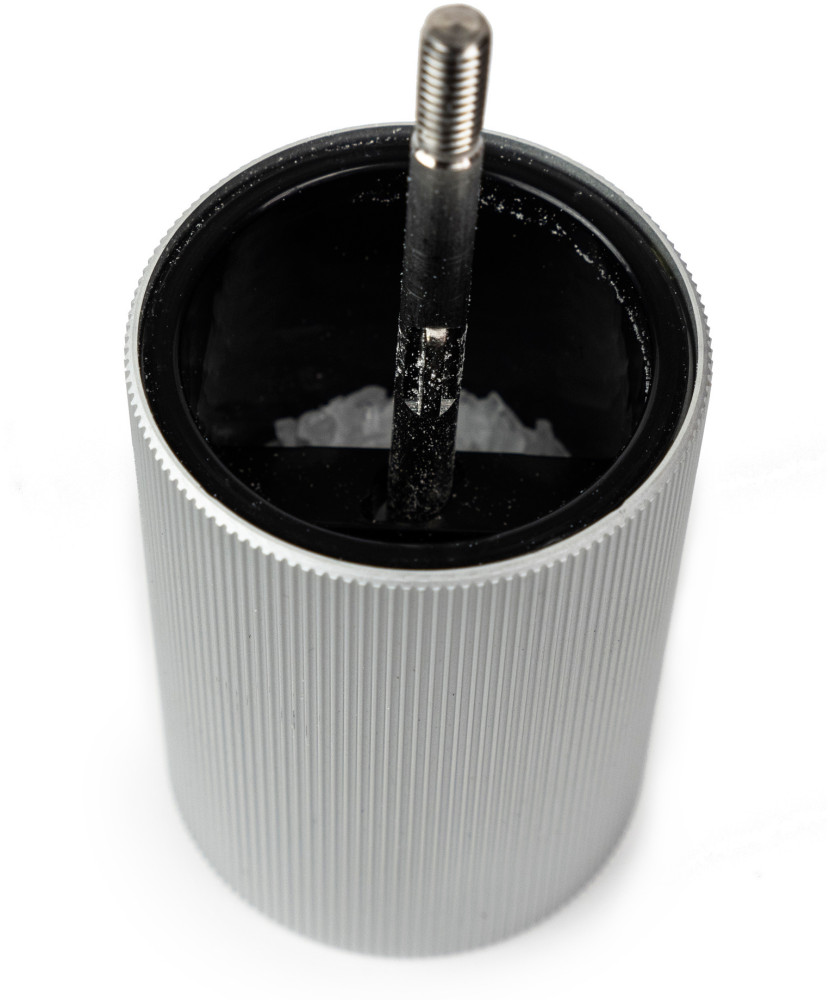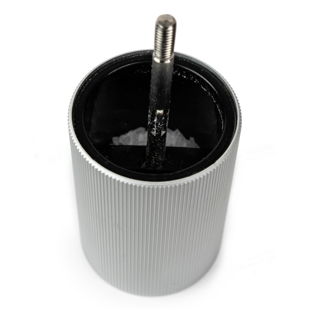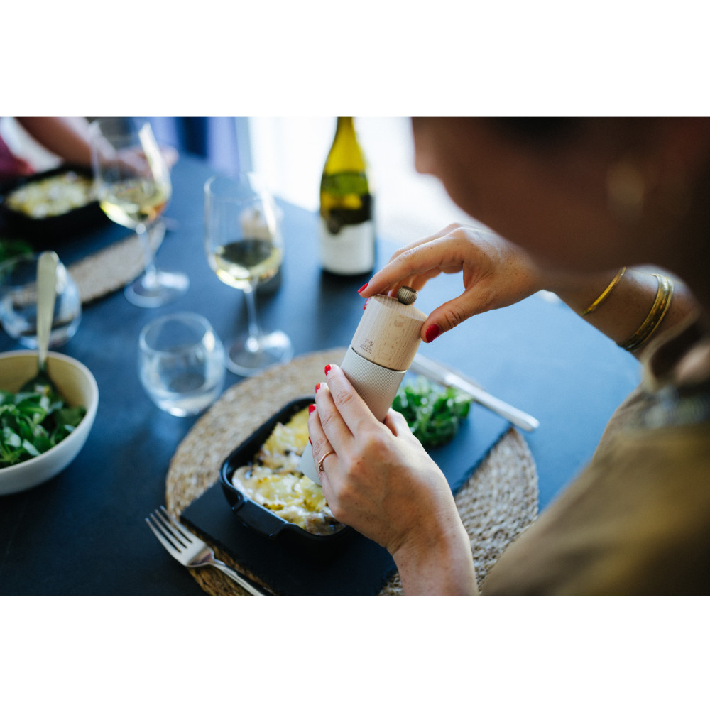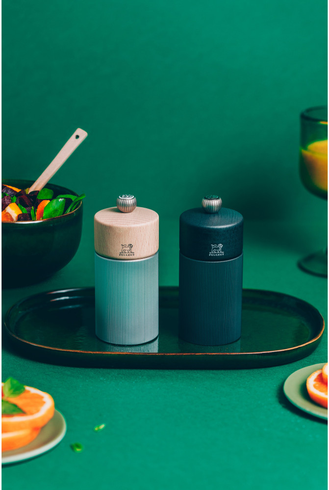 Młynki doskonale prezentuje się na stole i w kuchni. Mechanizm mielący to autorska precyzyjna konstrukcja objęta dożywotnią gwarancją. Dostosowanie grubości mielenia odbywa się poprzez dokręcenie pokrętła w górnej części korpusu. Młynki do soli i pieprzu można dowolnie komponować w ramach dostępnych wariantów Natural Aluminium i Dark Carbone.