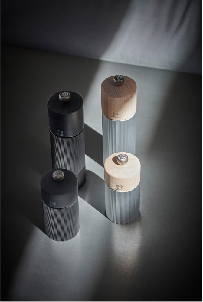 Młynki doskonale prezentuje się na stole i w kuchni. Mechanizm mielący to autorska precyzyjna konstrukcja objęta dożywotnią gwarancją. Dostosowanie grubości mielenia odbywa się poprzez dokręcenie pokrętła w górnej części korpusu. Młynki do soli i pieprzu można dowolnie komponować w ramach dostępnych wariantów Natural Aluminium i Dark Carbone.