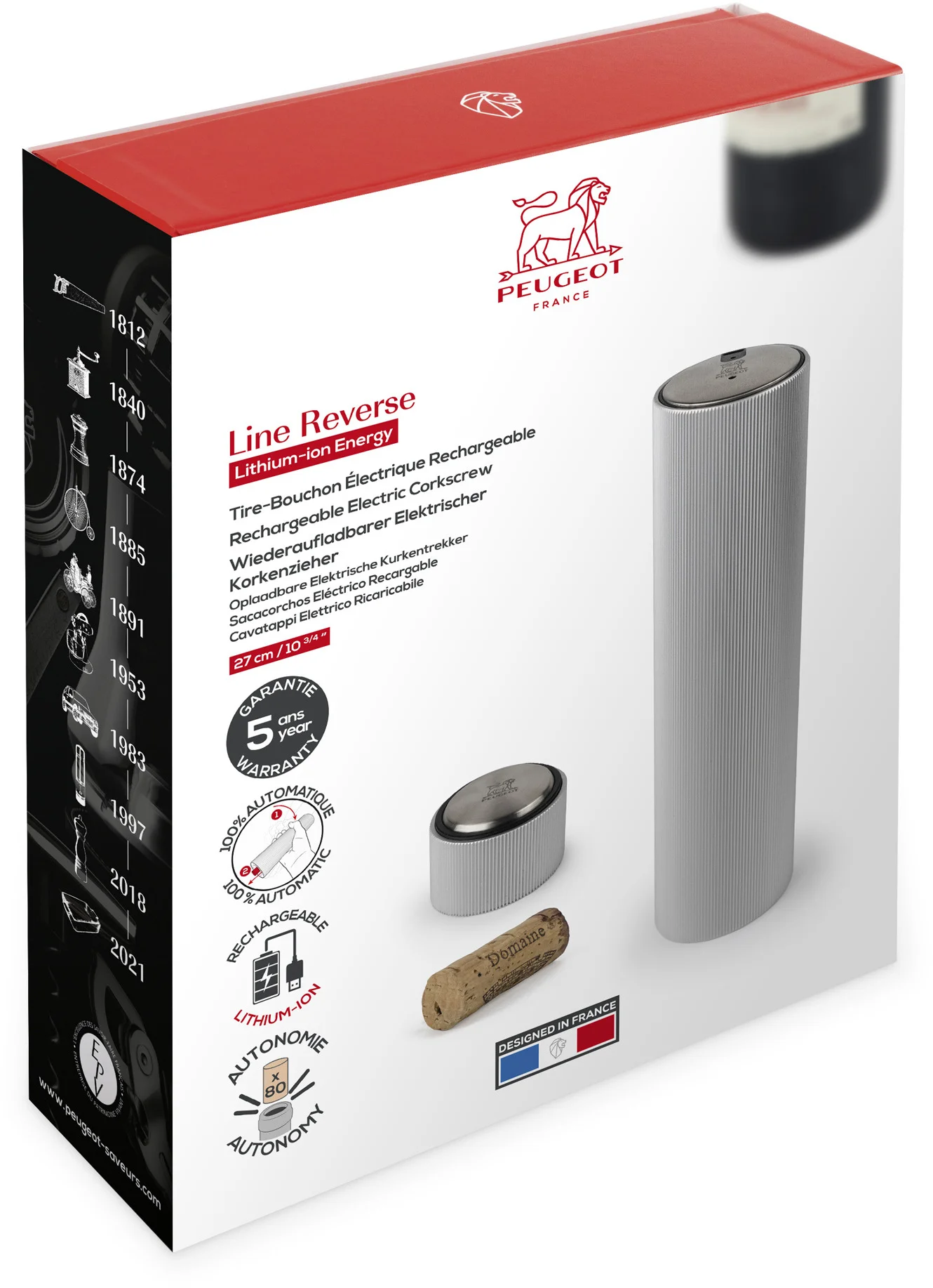 LINE REVERSE ALUMINIUM firmy Peugeot to w pełni zautomatyzowany korkociąg, dzięki któremu odkorkowywanie win staje się niezwykle łatwe. To idealny prezent dla wszystkich entuzjastów wina!