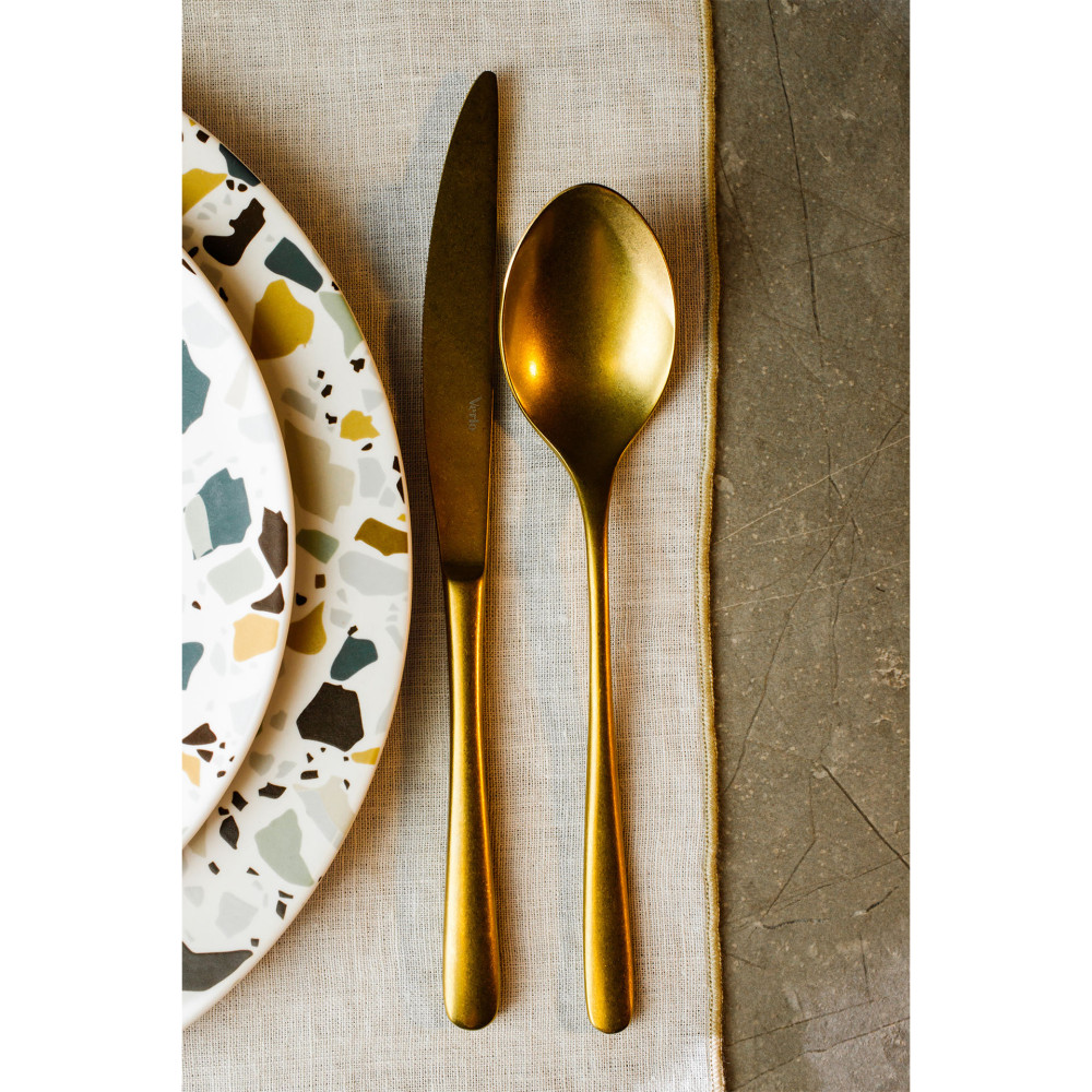Kolekcja LUI GOLD to idealny wybór nie tylko do nowoczesnego wnętrza, ale także do klasycznej kuchni lub jadalni z ekstrawaganckim akcentem. Prosta stylistyka, brak zdobień i piękne matowe wykończenie. To kolekcja idealna dla osób poszukujących nowoczesnych akcentów. Obłe, masywne wykończenie trzonków sztućców doskonale podkreśla minimalistyczny styl tej linii.