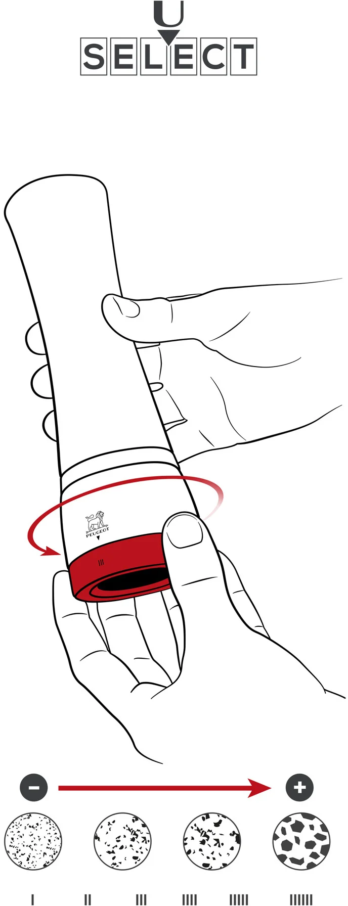 Młynki firmy PEUGEOT używane są w kuchniach na całym świecie od blisko 200 lat stając się ikoną francuskiej kuchni. Większość cyklu produkcyjnego odbywa się w fabryce PEUGEOT w Quingey znajdującej się w departamencie Doubs w Burgundii. Dzięki pełnej kontroli produkcji mechanizmy mielące młynków objęte są dożywotnią gwarancją. W młynkach Peugeot używane są autorskie mechanizmy mielące dedykowane do różnych rodzajów przypraw. Młynki do soli mogą służyć do mielenia soli grubej, morskiej i kamiennej. O granulacji do 4 mm. Młynki do pieprzu wyposażone są w specjalny mechanizm o spiralnym kształcie żaren, gwarantującym optymalne wprowadzanie ziaren i ich mielenie. Ustawienie grubości mielenia w młynkach PEUGEOT może odbywać się bądź poprzez tradycyjną płynną regulację, bądź w przypadku młynków z mechanizmem uSelect przez wybór jednego z 6 stopni grubości mielenia.