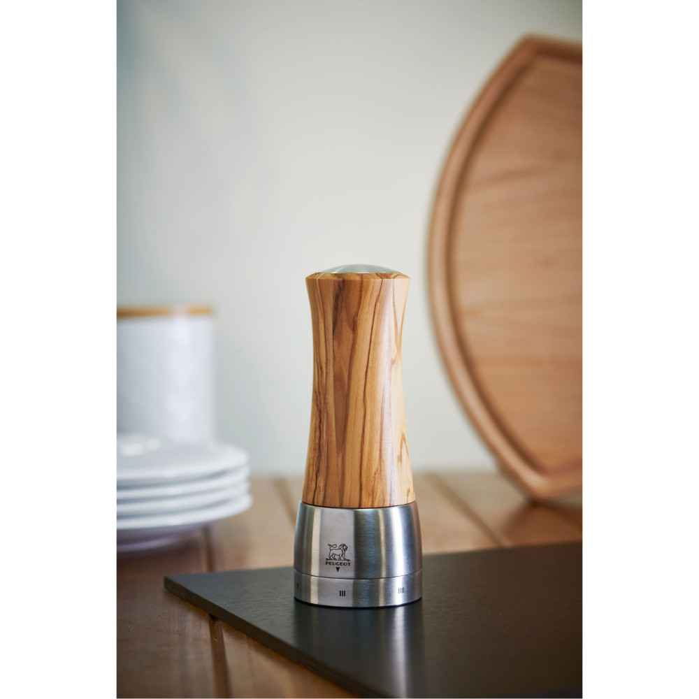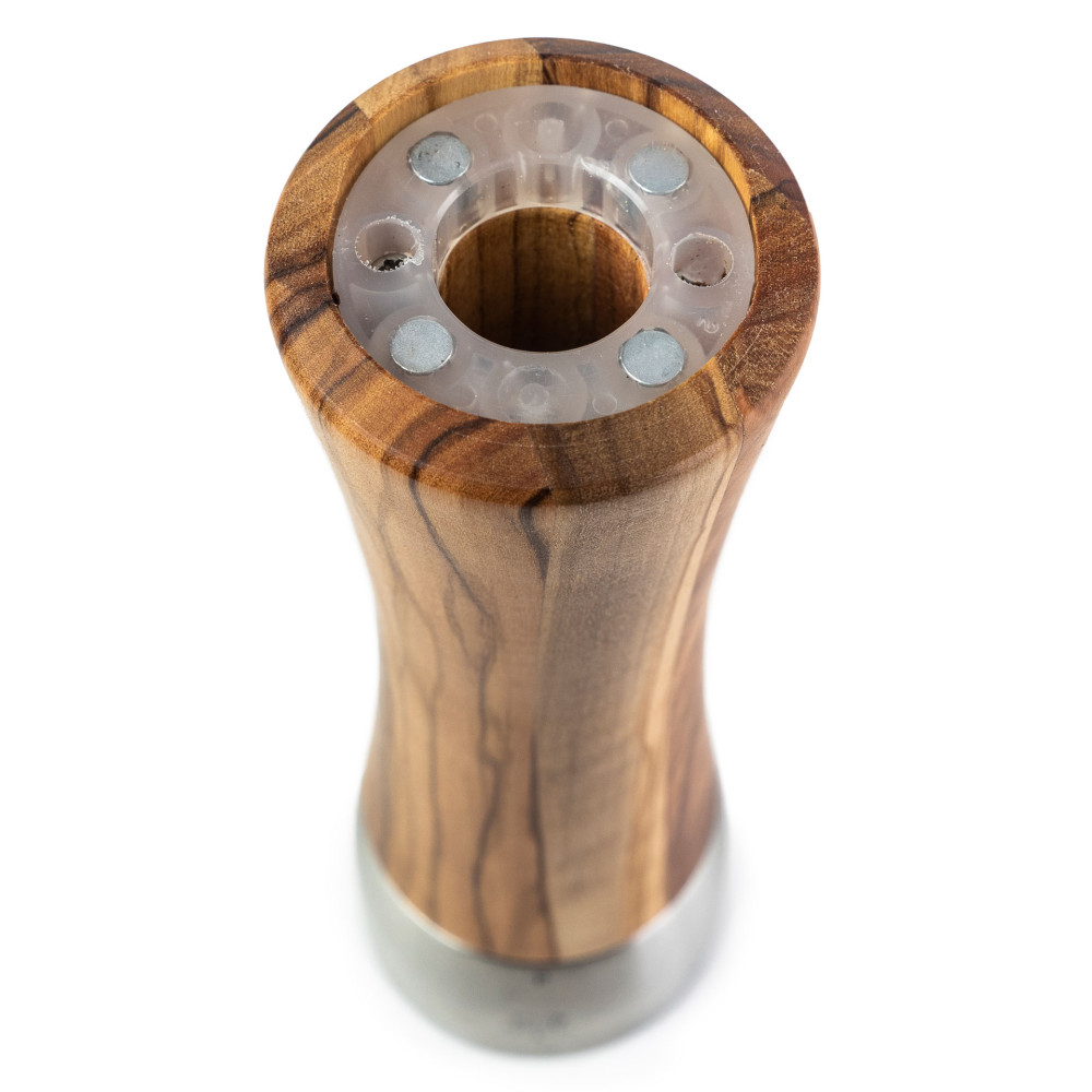 Manualny młynek MADRAS z drewna oliwnego to uosobienie wysublimowanej elegancji. Wyrazisty rysunek słojów drewna w połączeniu z minimalistyczną podstawą ze stali nierdzewnej tworzy wyjątkowy akcent w każdej kuchni. Magnetyczne zamknięcie ze stali nierdzewnej ułatwia otwieranie i napełnianie młynka.