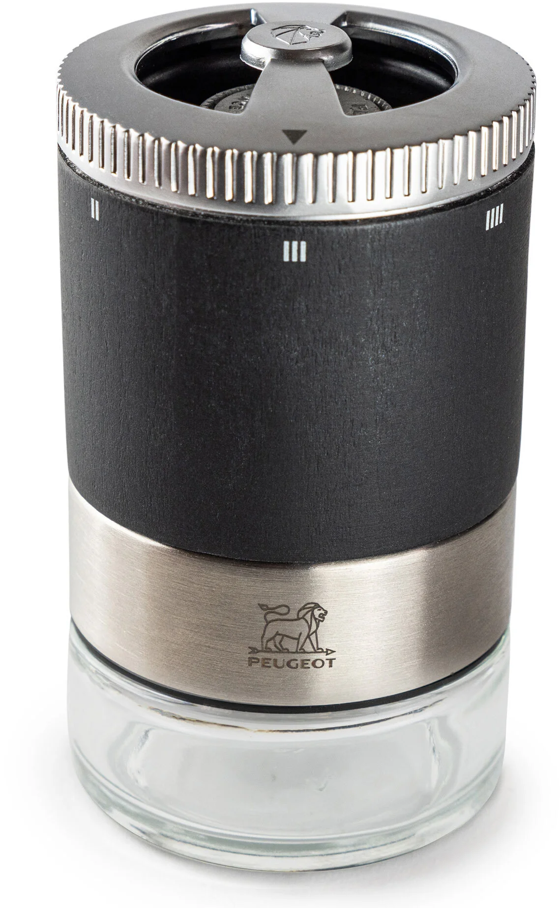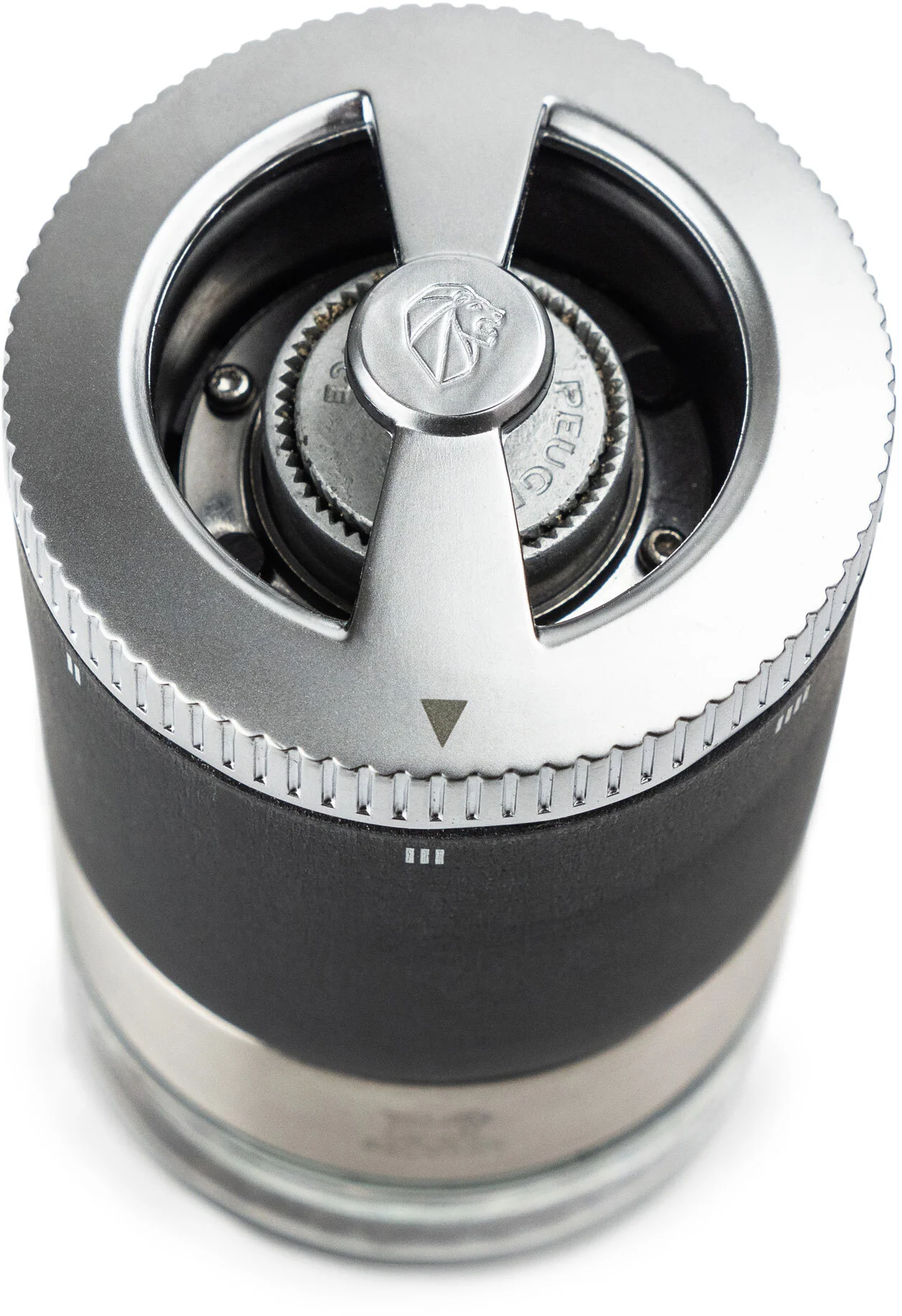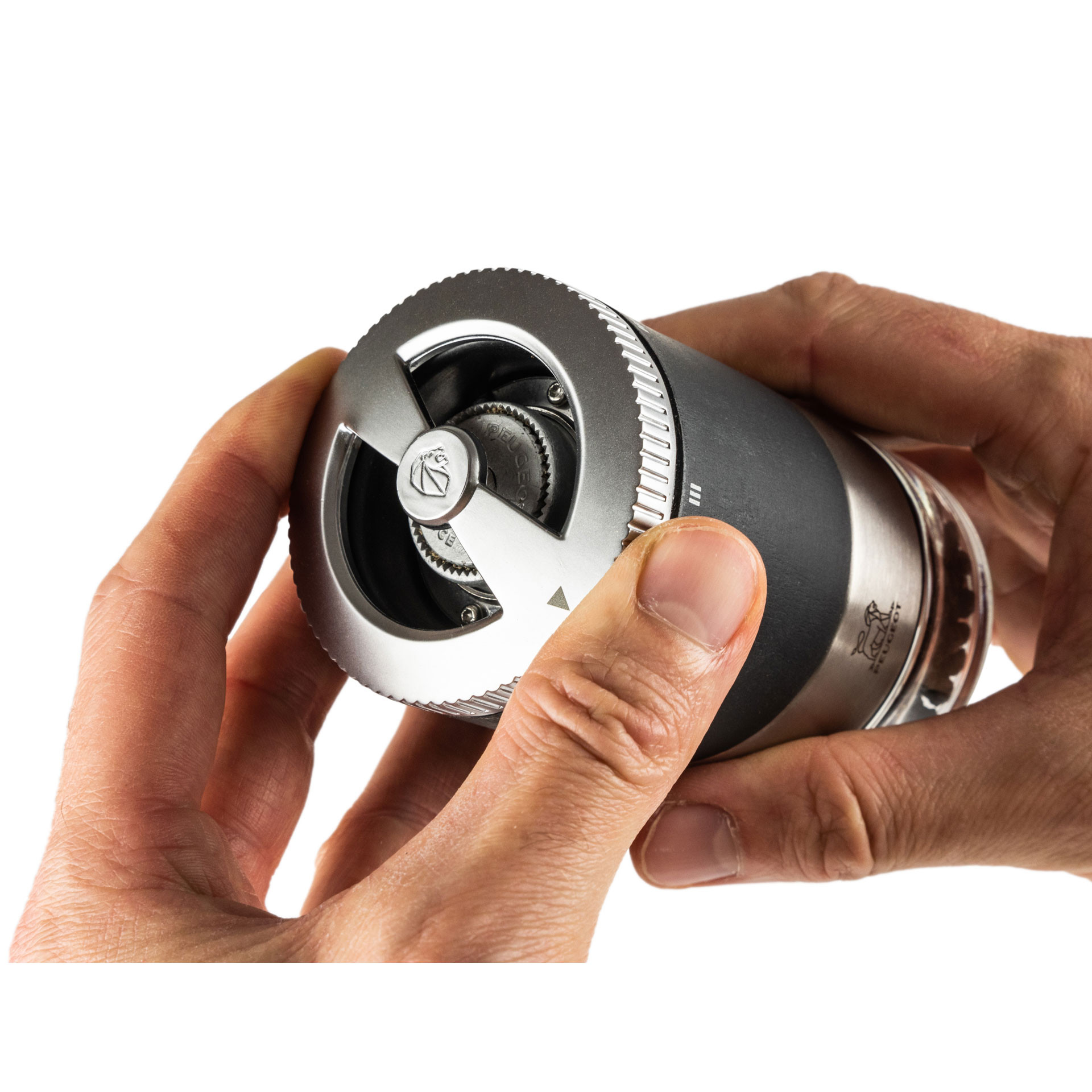 Ustawienie grubości mielenia w młynkach PEUGEOT może odbywać się bądź poprzez tradycyjną płynną regulację dzięki dokręceniu pokrętła w górnej części korpusu, bądź w przypadku młynków z mechanizmem uSelect, przez wybór jednego z 6 stopni grubości mielenia.