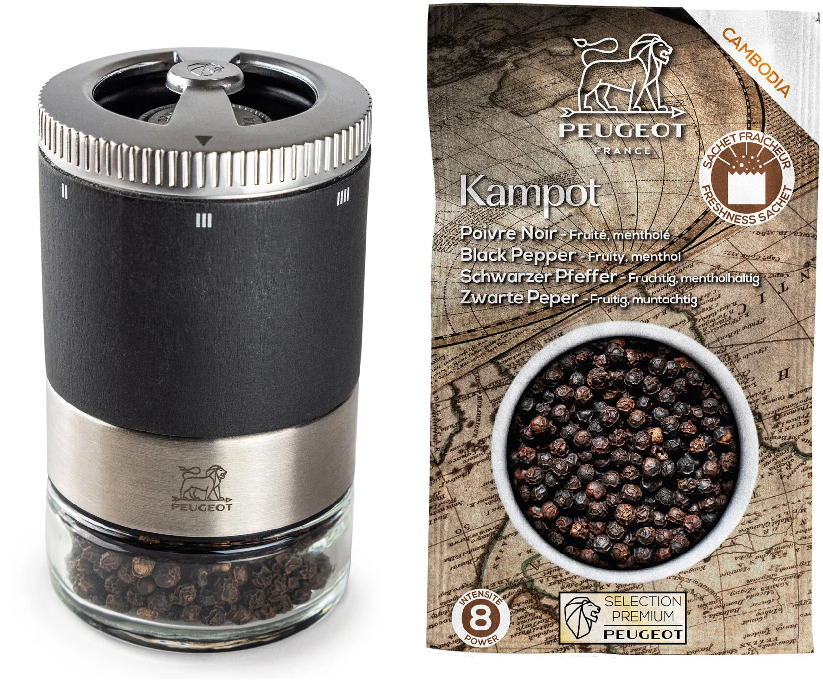 Młynek do pieprzu Maestro dostarczany jest z czarnym pieprzem Kampot. Czarny, organiczny pieprz KAMPOT to wyrazisty, owocowy smak z nutą świeżej mięty. Ten czarny pieprz uprawiany jest w ekologicznym gospodarstwie o certyfikowanym statusie sprawiedliwego handlu. Uprawa pochodzi z regionu Kampot w południowo-zachodniej Kambodży, graniczącym z morzem. Morska bryza oraz wilgotne powietrze mają znaczący wpływ na intensywność smaku i jakość ziaren. Teren ten otrzymał również oznaczenie Chronione Oznaczenie Geograficzne (ang. – Protected Geographical Indications – PGI) co podkreśla szczególną jakość tej przyprawy.