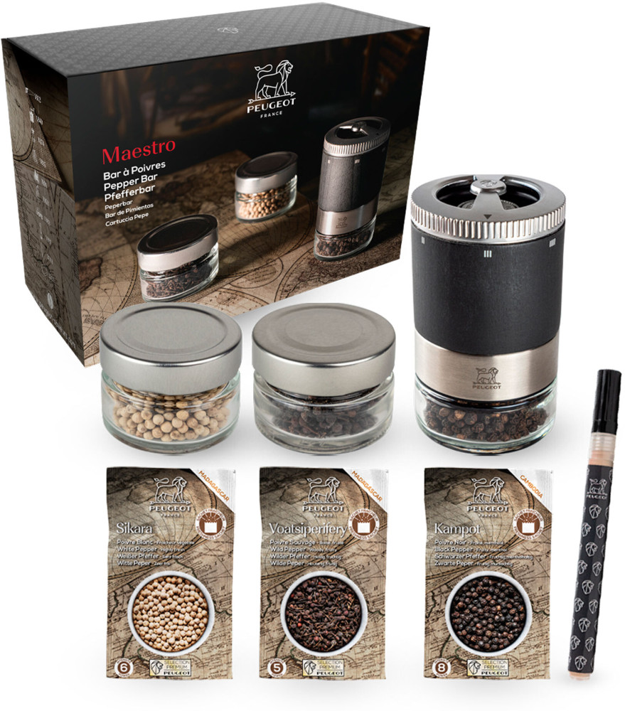 Zestaw prezentowy Peugeot MAESTRO to doskonałe połączenie funkcjonalnego młynka do pieprzu, trzech różnych rodzajów pieprzu, szklanych pojemników oraz markera, dzięki któremu można z łatwością oznaczyć słoiczek. Piękne połączenie drewna bukowego z nowoczesną, minimalistyczną i „chłodną” stalą oraz szkłem to wyróżnik tej kolekcji. Szklany słoiczek można łatwo odkręcić i napełnić ulubionym pieprzem. Służy również jako dozownik pieprzu oraz pojemnik do przechowywania ulubionych rodzajów przypraw. Zamykany dzięki szczelnej nakrętce, na długo zachowa cenne zapachy i aromaty przyprawy. Większą ilość szklanych słoiczków można dokupić również oddzielnie. Łatwo i sprawnie można zmieniać ulubione rodzaje przypraw i dostosowywać ich smakowe niuanse do przygotowywanych potraw. Wyposażony w opatentowany system u'Select, ułatwia wybór stopnia mielenia, od najdrobniejszego do najgrubszego. Zestaw pakowany jest w elegancki karton i stanowi doskonałą propozycję na upominek dla miłośników dobrej kuchni.