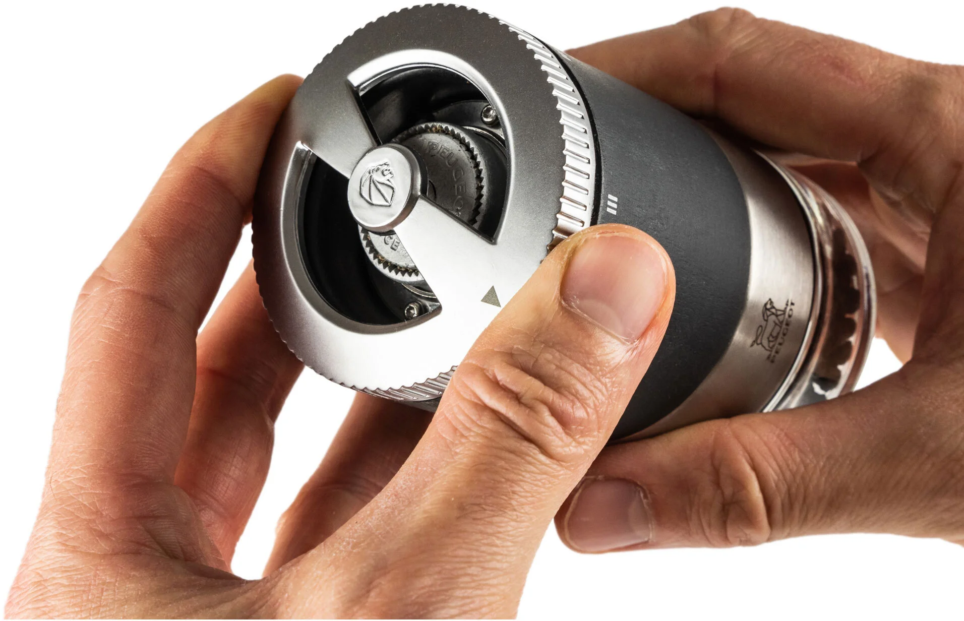 Ustawienie grubości mielenia w młynkach PEUGEOT może odbywać się bądź poprzez tradycyjną płynną regulację dzięki dokręceniu pokrętła w górnej części korpusu, bądź w przypadku młynków z mechanizmem uSelect, przez wybór jednego z 6 stopni grubości mielenia.