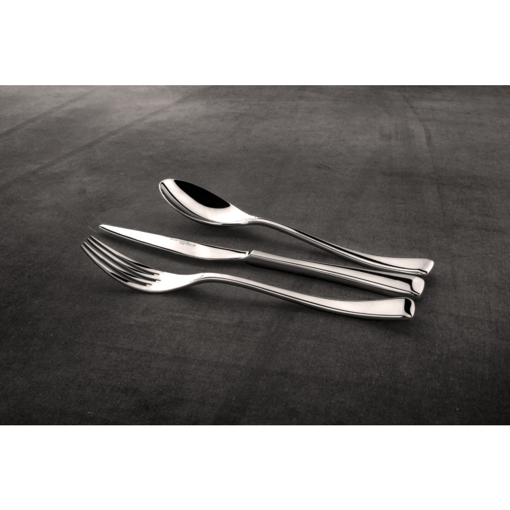 MAHEBardzo charakterystyczna linia sztućców, pięknie prezentująca się z minimalistyczną zastawą stołową. Masywne, wygodne, rozszerzające się ku dołowi rękojeści podkreślają nowatorski styl. Warto zwrócić uwagę, że w kolekcji tej dostępny jest nóż, który można ustawić na ostrzu. Ten niebanalny akcent zapewne zachwyci gości i nada stylizacji stołu wyjątkowego akcentu.