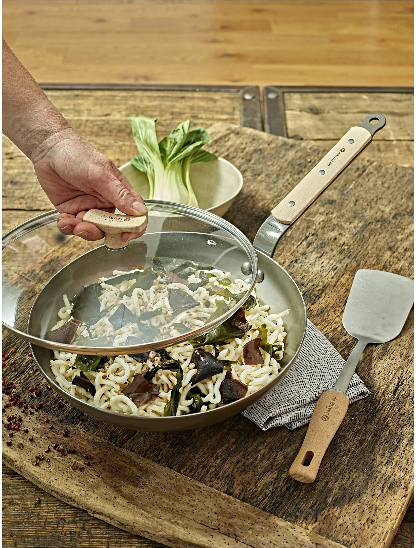 Pokrywka szklana marki deBuyer to doskonały dodatek do naczyń serii MINERAL B BOIS. Wykonana ze szkła, zapewnia dobrą widoczność podczas gotowania, a głęboka krawędź idealnie dopasowuje się do naczyń. Dzięki małemu otworowi para dyskretnie uwalnia się, nie powodując podnoszenia się pokrywy. Drewniany, ergonomiczny uchwyt ułatwia obsługę gotowania.
