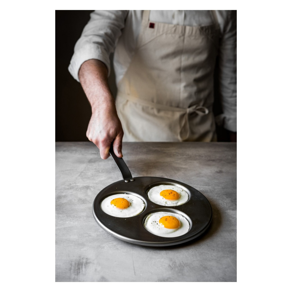 Wykonana ze stali węglowej, zabezpieczona naturalnym woskiem pszczelim, ta patelnia doskonale sprawdza się w smażeniu jajek i placków. Jest idealna do podkreślania smaku dzięki tzw. reakcji Maillarda, podczas której dochodzi do karmelizacji naturalnych soków na powierzchni żywności, utrzymując jednocześnie jej miękkość w środku. Dzięki temu procesowi potrawy nabierają głębokiego aromatu i intensywnego smaku.