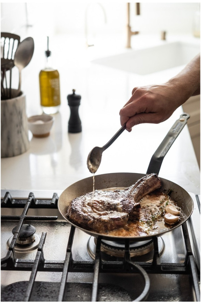 Wykonana ze stali węglowej, zabezpieczona naturalnym woskiem pszczelim, ta patelnia doskonale sprawdza się w smażeniu, grillowaniu i przyrumienianiu potraw. Jest idealna do podkreślania smaku dzięki tzw. reakcji Maillarda, podczas której dochodzi do karmelizacji naturalnych soków na powierzchni żywności, utrzymując jednocześnie jej miękkość w środku. Dzięki temu procesowi potrawy nabierają głębokiego aromatu i intensywnego smaku.