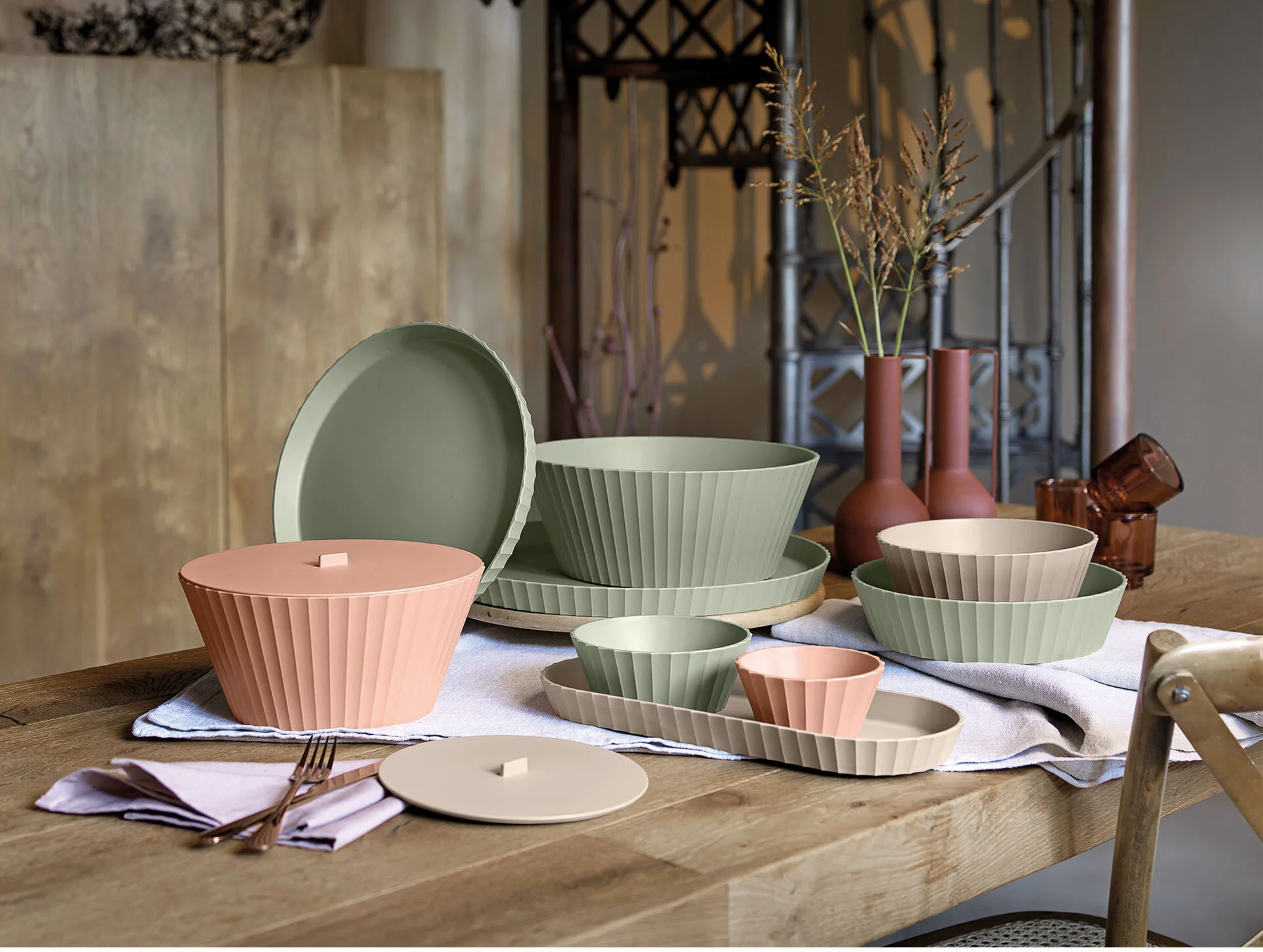 Zachowawczość pięknych, pastelowych barw, prostota formy, dbałość o szczegóły geometryczne i ergonomię to wszystko tworzy harmonijną i doskonałą kompozycję dekoracji stołu. Blim Plus oferuje nową ideę kuchni zaprojektowaną z pełnym poszanowaniem środowiska dzięki jakościowemu i świadomemu wykorzystaniu tworzywa sztucznego.