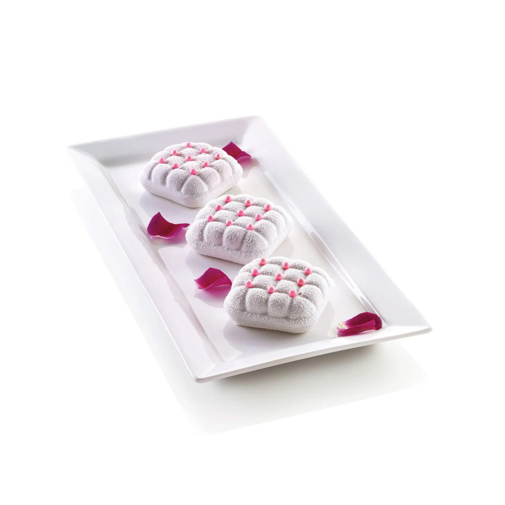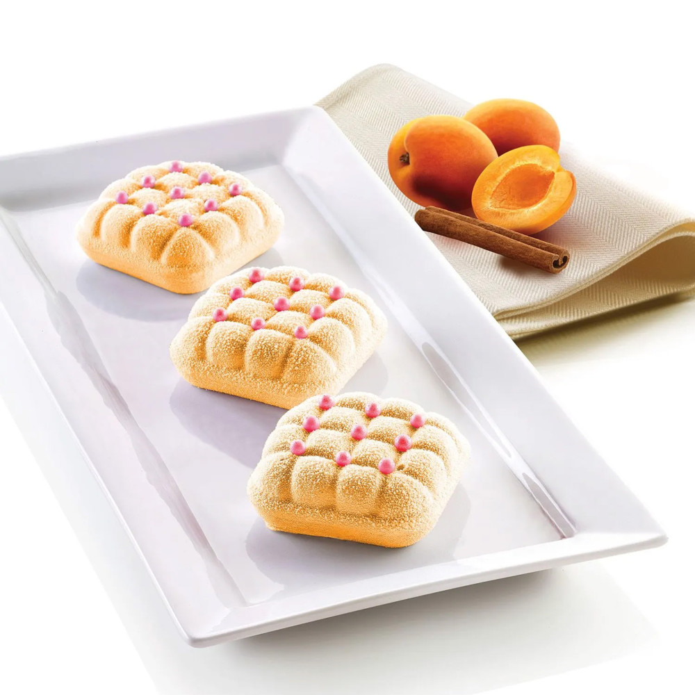 Kształt formy Mini Eleganza z linii 3Design firmy Silikomart gwarantuje doskonałe rezultaty nie tylko w wersji semifreddo i mousse, ale także w wersji do wypiekania. Innowacyjna technologia 3D marki Silikomart sprawia, że wyjmowanie deserów z formy jest szybkie i łatwe, co pozwala osiągnąć perfekcyjne efekty. Może być wykorzystywana do przygotowywania różnych rodzajów deserów, w tym ciast i wielu innych. Ta forma to imitacja filigranowych poduszeczek, co daje zaskakujący i oryginalny efekt w tworzeniu kreatywnych deserów.Forma silikonowa - Mini Eleganza posiada 6 kwadratowych zagłębień, każde o pojemności 101 ml.