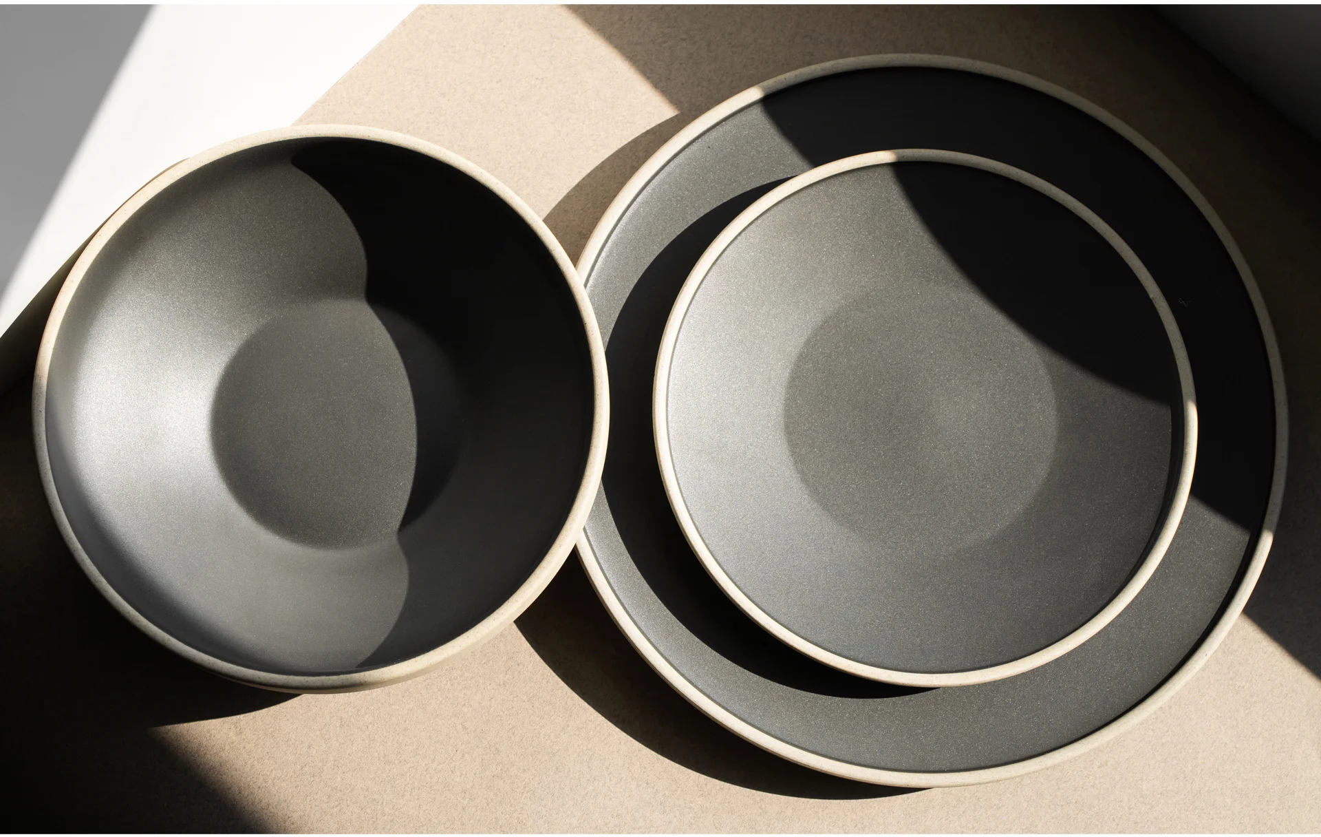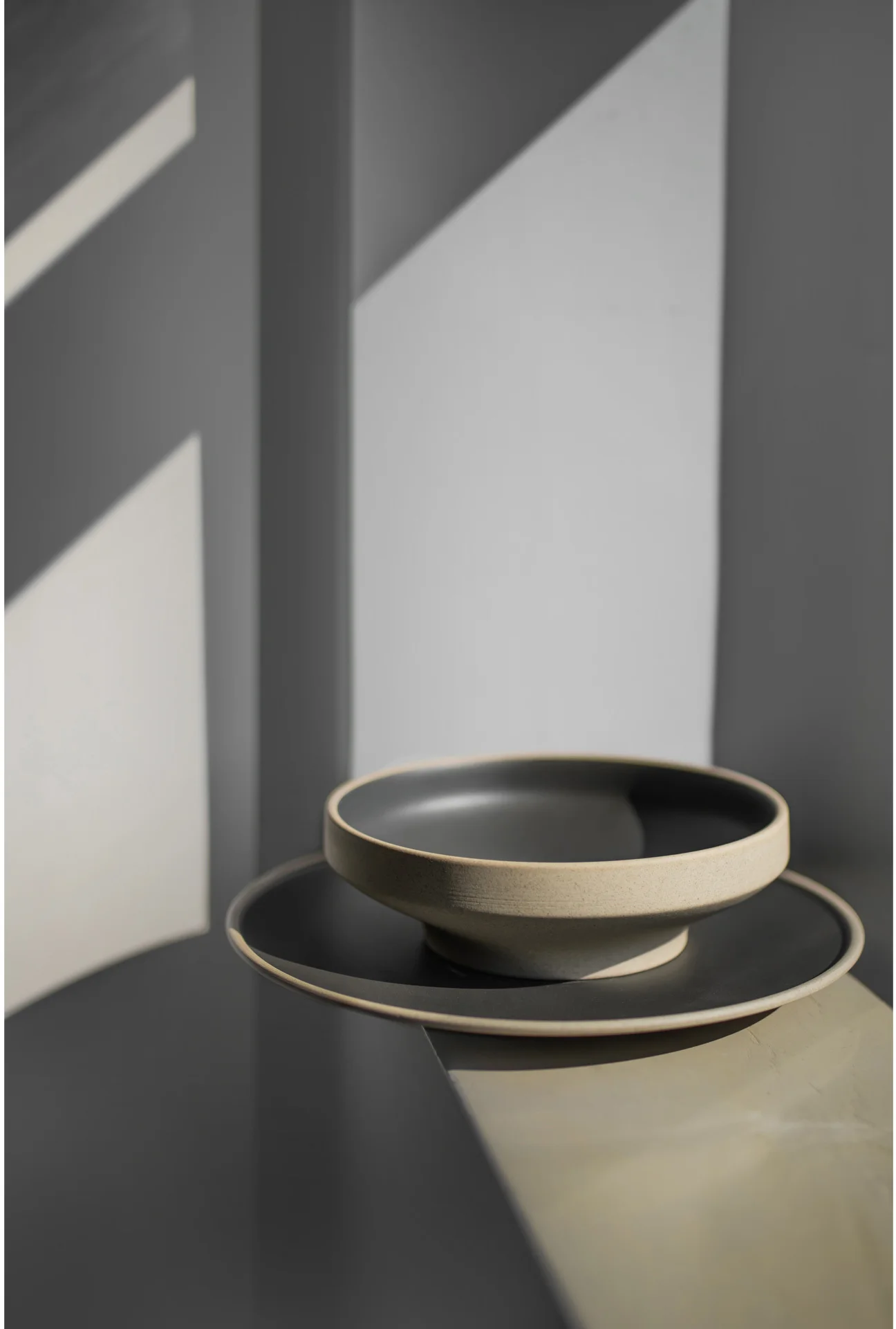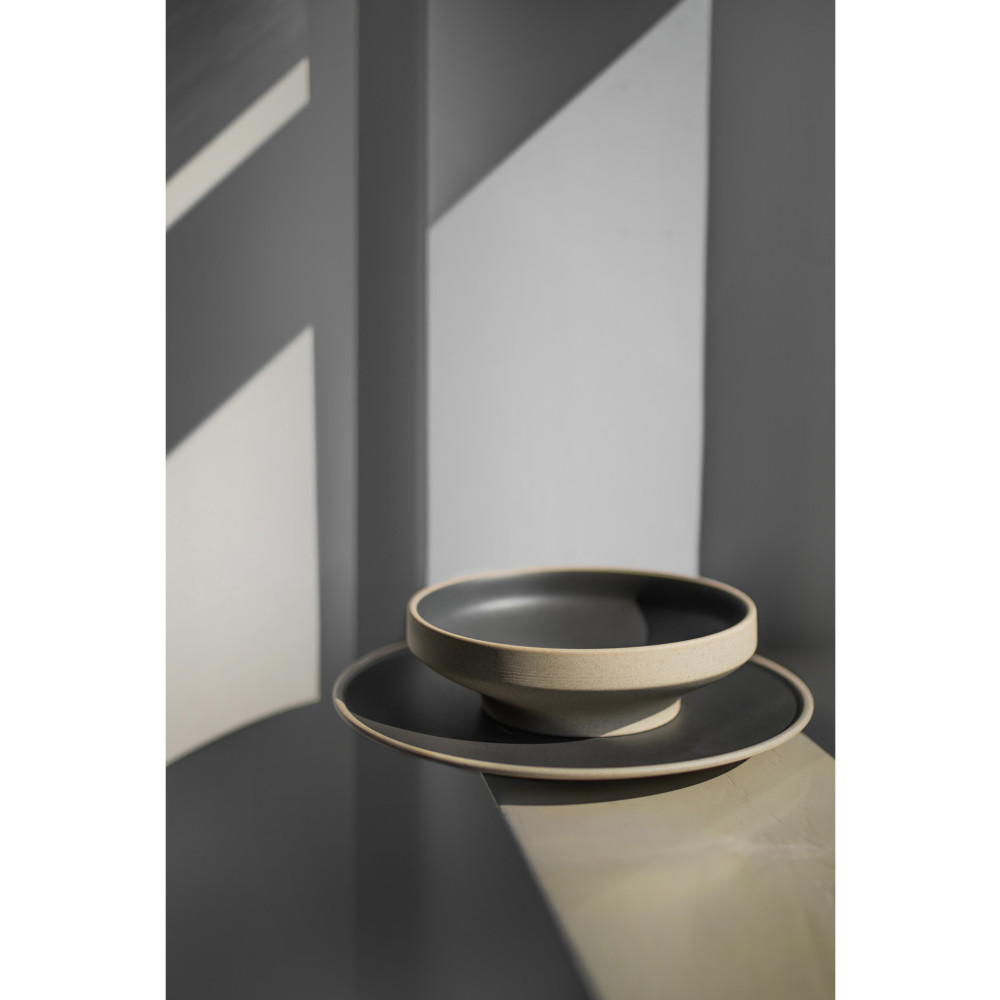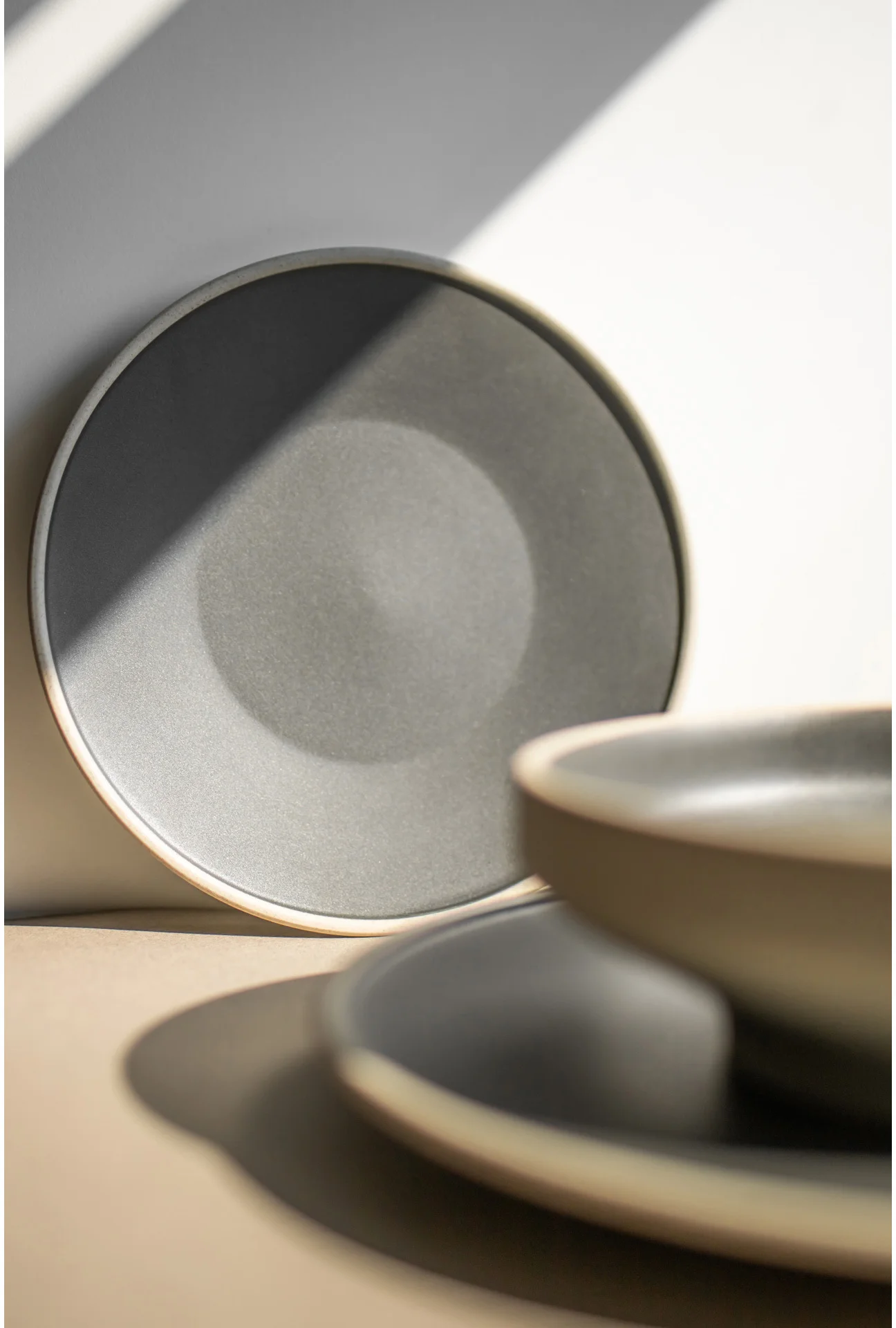 MINIMAL to harmonijne połączenie naturalnego odcienia porcelany, przypominającego barwę piasku pustyni, z głębokim nieco metalicznym grafitem. Ten wyjątkowy duet kolorów doda elegancji i harmonii każdej aranżacji stołu. Surowe, nieco szorstkie wykończenie zarówno na wewnętrznych, jak i zewnętrznych powierzchniach naczyń, nadaje im niepowtarzalnego charakteru. Wewnętrzne zabarwienie w odcieniu metalicznego grafitu, delikatnie odbija światło, eksponując subtelność tej kolekcji. Charakterystyczną cechą tej porcelany jest również mocno zarysowany, gruby, niebarwiony rant.