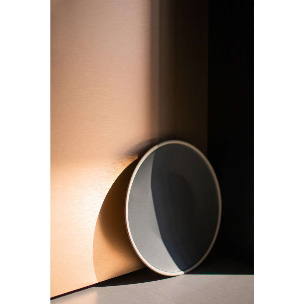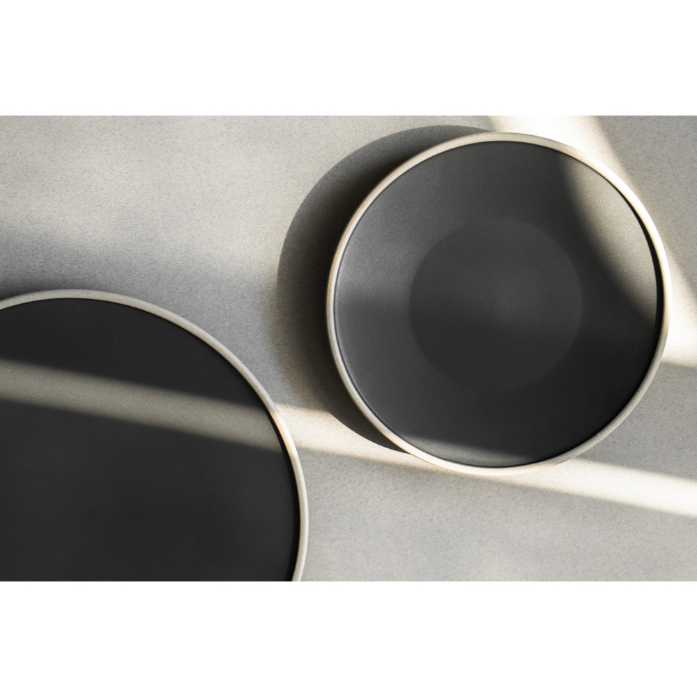 MINIMAL to harmonijne połączenie naturalnego odcienia porcelany, przypominającego barwę piasku pustyni, z głębokim nieco metalicznym grafitem. Ten wyjątkowy duet kolorów doda elegancji i harmonii każdej aranżacji stołu. Surowe, nieco szorstkie wykończenie zarówno na wewnętrznych, jak i zewnętrznych powierzchniach naczyń, nadaje im niepowtarzalnego charakteru. Wewnętrzne zabarwienie w odcieniu metalicznego grafitu, delikatnie odbija światło, eksponując subtelność tej kolekcji. Charakterystyczną cechą tej porcelany jest również mocno zarysowany, gruby, niebarwiony rant.