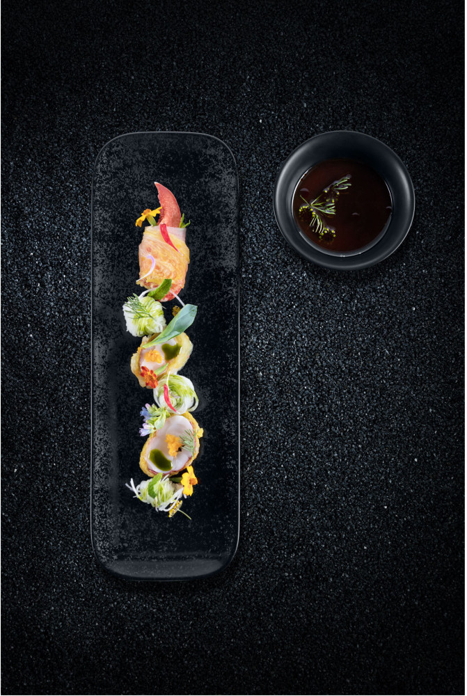 Linia KARBON nawiązuje do wyobrażeń o powstaniu świata, kiedy czarna materia zroszona kryształkami i pyłem węgielnym, wypełniała nicość. Matowa glazura, mieniąca się szklistym pyłem, inspirowana jest strukturą naturalnego węgla kamiennego. Łagodne, minimalistyczne formy talerzy i naczyń są idealnym tłem dla głębokiej czerni szkliwa, by jako całość idealnie eskponować każde serwowane danie.
