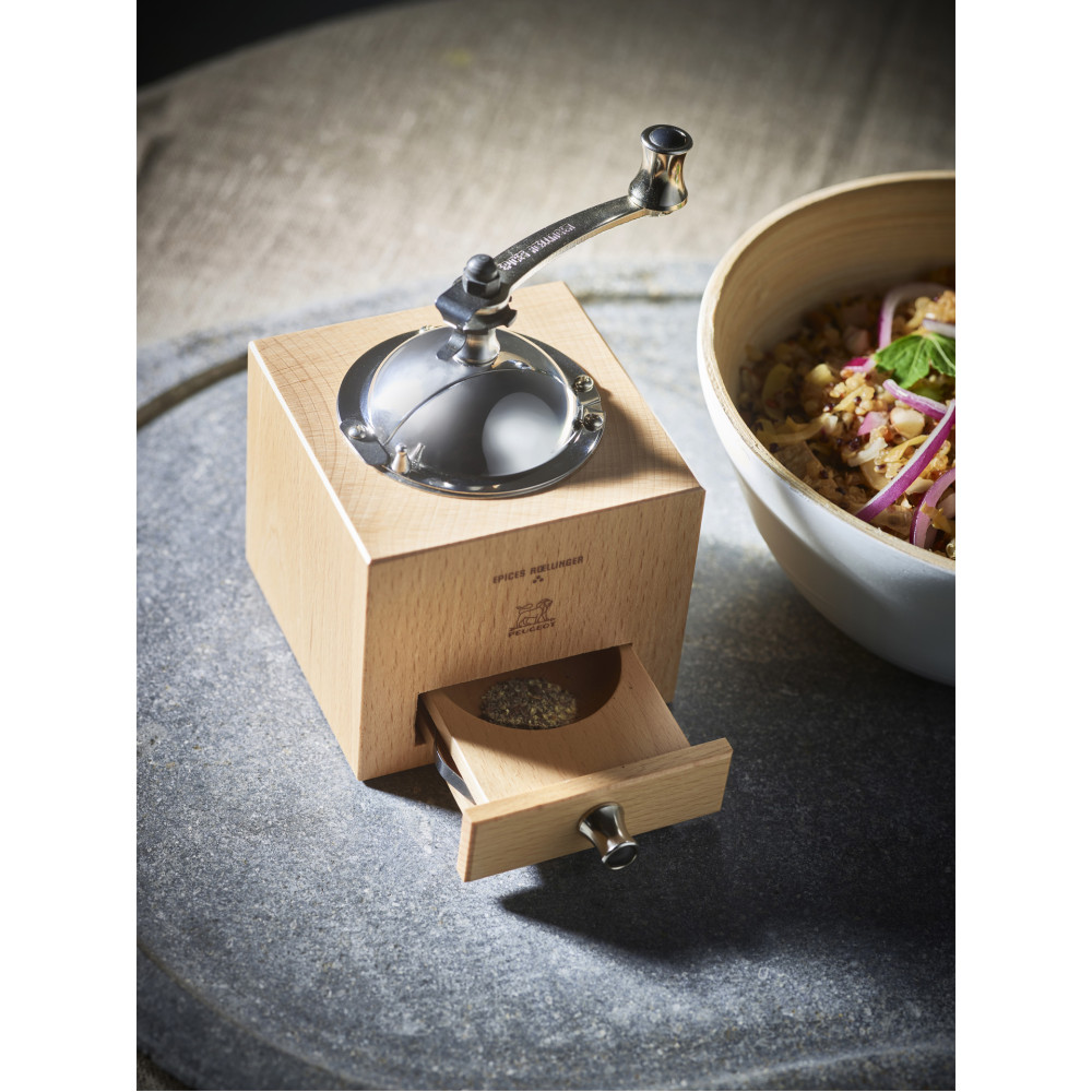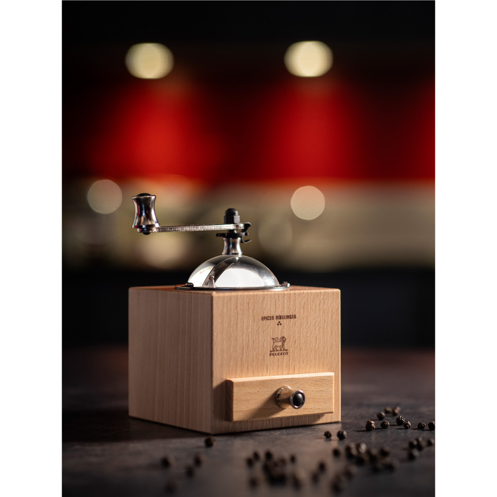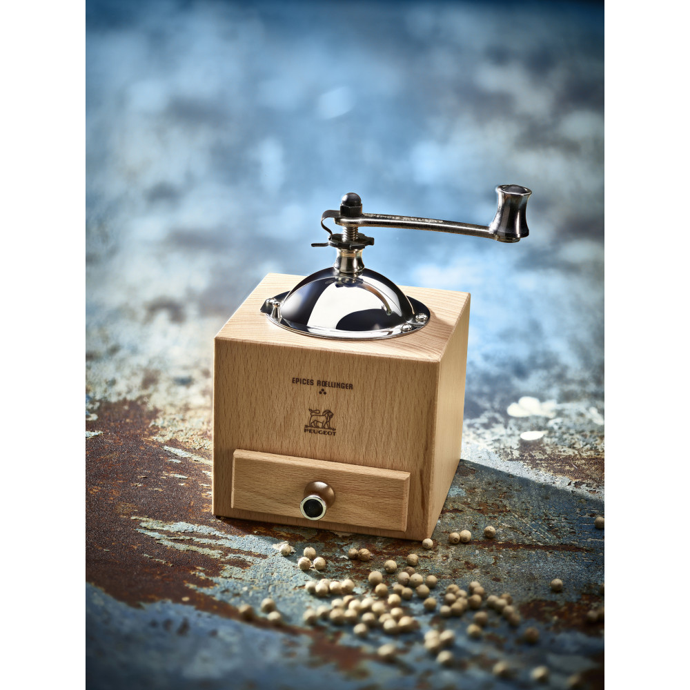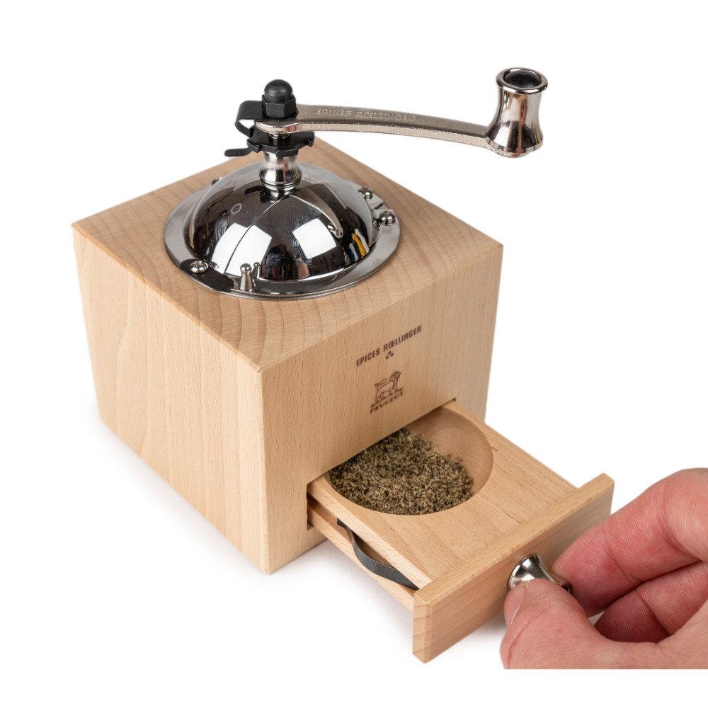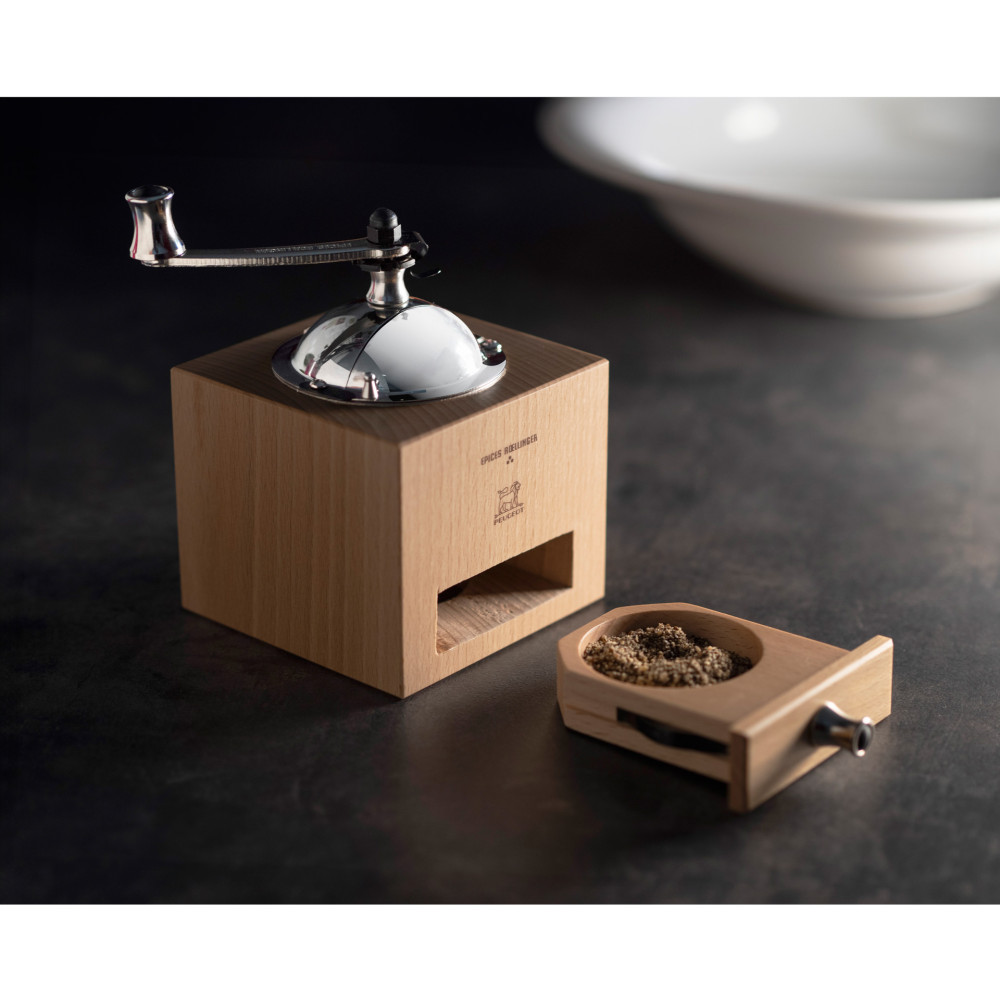 Drewniana, sześcienna obudowa wykonana z drewna bukowego, pomimo niedużych gabarytów jest niezwykle stabilna i wygodna podczas mielenia. Zamykany zbiornik na pieprz w górnej części młynka, wykonany jest ze stali nierdzewnej. Jego wykończenie w wysokim połysku nadaje młynkowi elegancji i podkreśla jego klasyczny design. Napełnianie młynka ziarnami pieprzu jest niezwykle łatwe, a zasuwka zabezpiecza przed wypadaniem ziaren podczas ich mielenia. Stalowa korbka służąca do napędzania młynka jest w doskonałych proporcjach, a jej stalowe minimalistyczne i efektowne zakończenie sprawia, że wygodnie się ją trzyma i wprowadza w ruch. Specjalny kształt szufladki i jej wgłębienie pozwala na precyzyjne zbieranie świeżo zmielonej przyprawy. Jej otwieranie i zamykanie są niezwykle łatwe i płynne. Emblemat z symbolem lwa – znak firmowym marki Peugeot - nadaje całości szyku i wysublimowania. Regulacja stopnia mielenia (mniej lub bardziej drobnego pieprzu) odbywa się za pomocą pokrętła znajdującego się pod korbką.