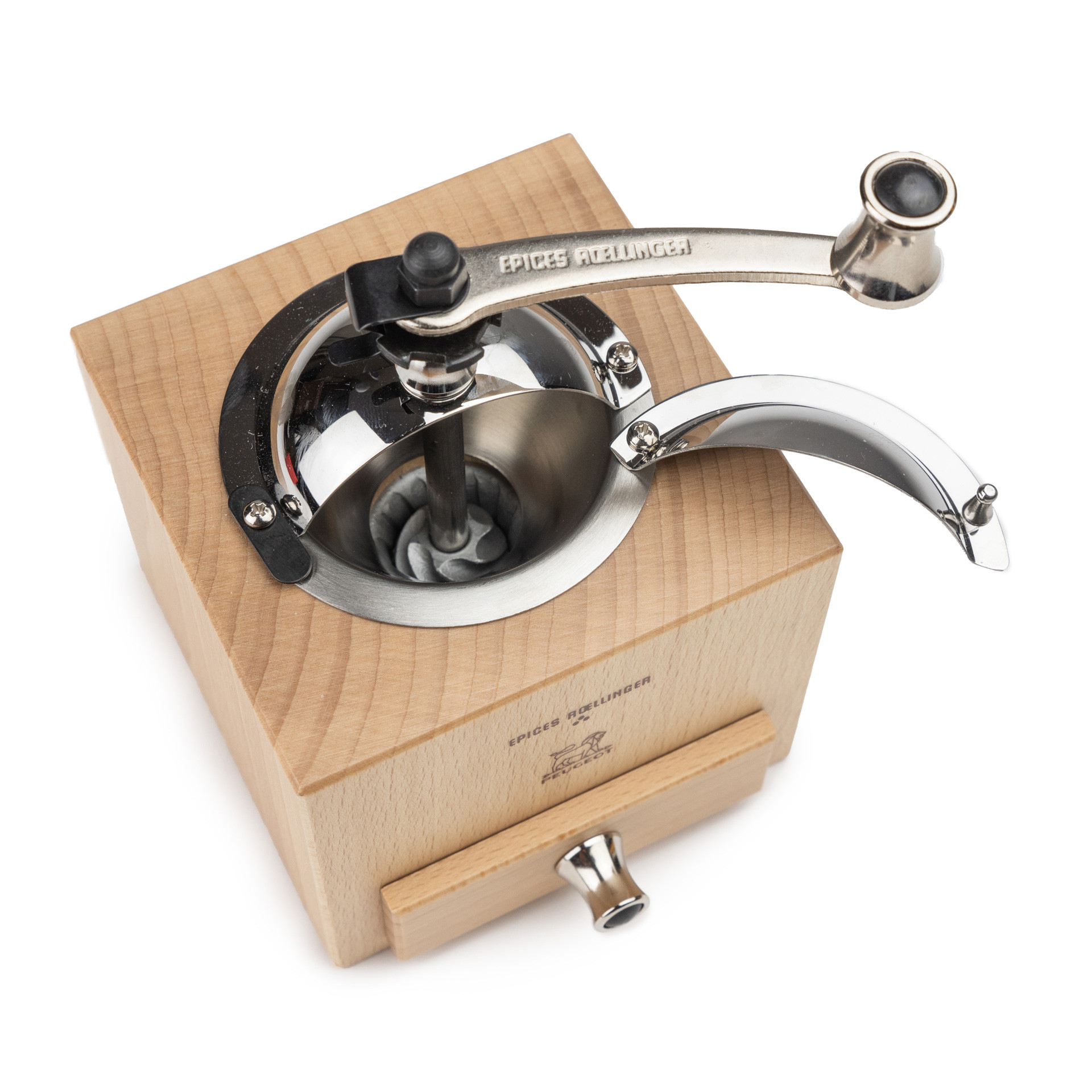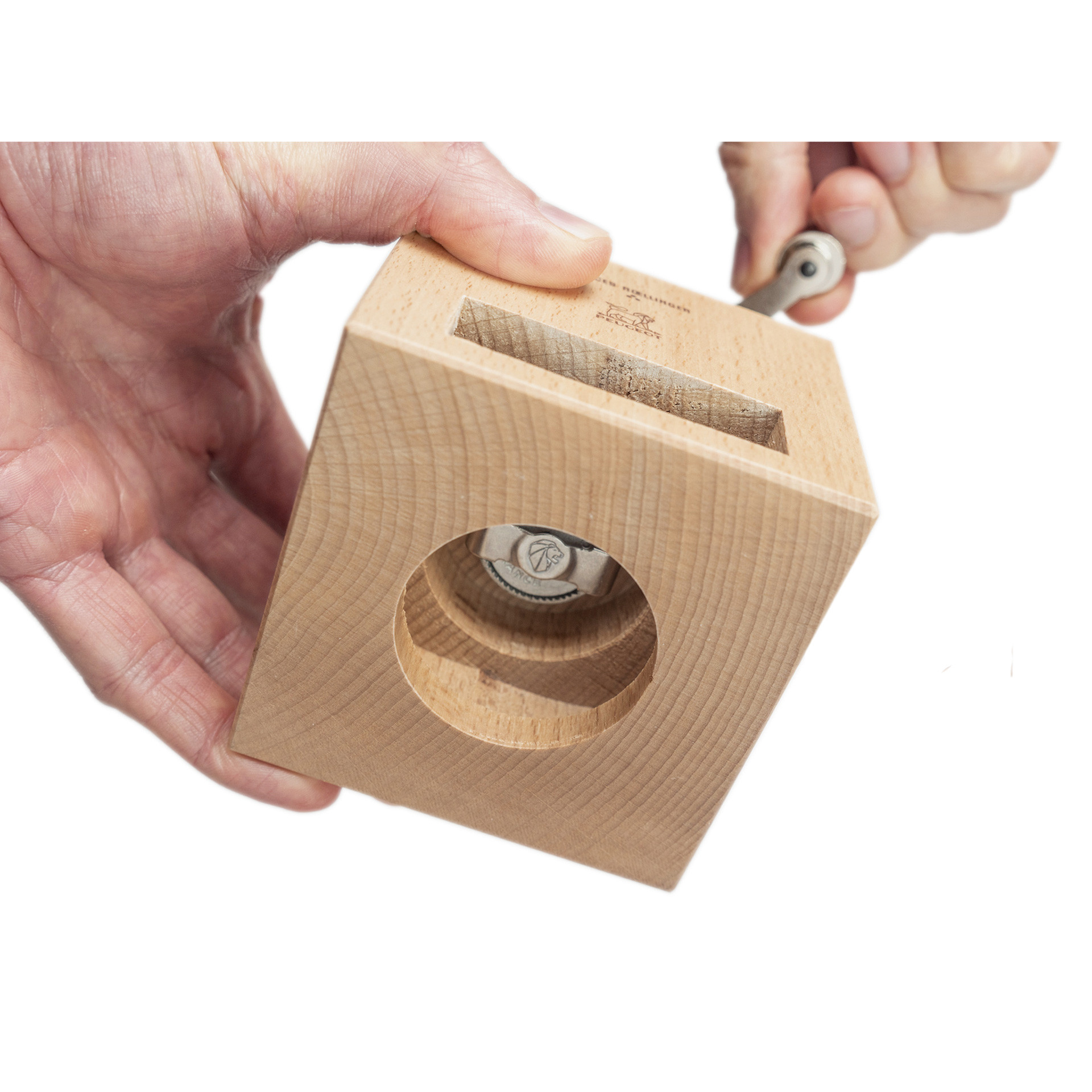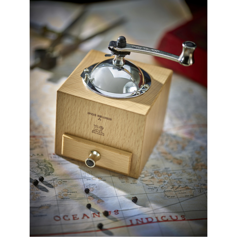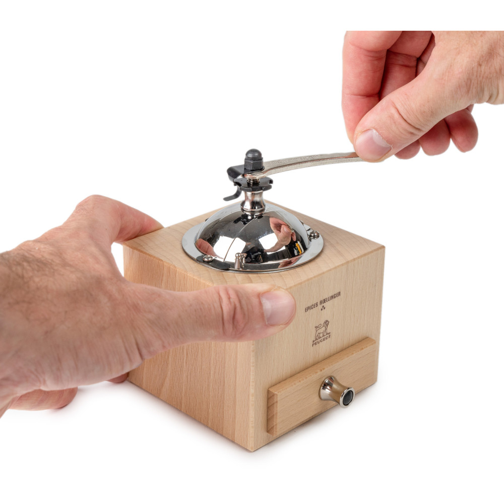 Drewniana, sześcienna obudowa wykonana z drewna bukowego, pomimo niedużych gabarytów jest niezwykle stabilna i wygodna podczas mielenia. Zamykany zbiornik na pieprz w górnej części młynka, wykonany jest ze stali nierdzewnej. Jego wykończenie w wysokim połysku nadaje młynkowi elegancji i podkreśla jego klasyczny design. Napełnianie młynka ziarnami pieprzu jest niezwykle łatwe, a zasuwka zabezpiecza przed wypadaniem ziaren podczas ich mielenia. Stalowa korbka służąca do napędzania młynka jest w doskonałych proporcjach, a jej stalowe minimalistyczne i efektowne zakończenie sprawia, że wygodnie się ją trzyma i wprowadza w ruch. Specjalny kształt szufladki i jej wgłębienie pozwala na precyzyjne zbieranie świeżo zmielonej przyprawy. Jej otwieranie i zamykanie są niezwykle łatwe i płynne. Emblemat z symbolem lwa – znak firmowym marki Peugeot - nadaje całości szyku i wysublimowania. Regulacja stopnia mielenia (mniej lub bardziej drobnego pieprzu) odbywa się za pomocą pokrętła znajdującego się pod korbką.
