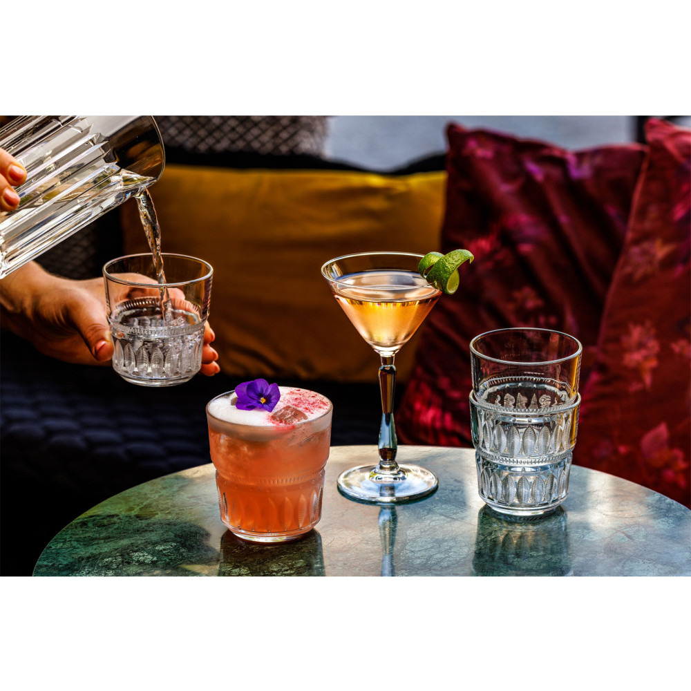 NEW ERA to elegancka seria szkła o wyglądzie nawiązującym do stylu vintage. Jej unikalne detale w postaci efektownych dekorów doskonale podkreślają ten styl. Kolekcja obejmuje trzy szklanki, które można ustawiać jedną na drugiej, oraz pięć kieliszków do koktajli.