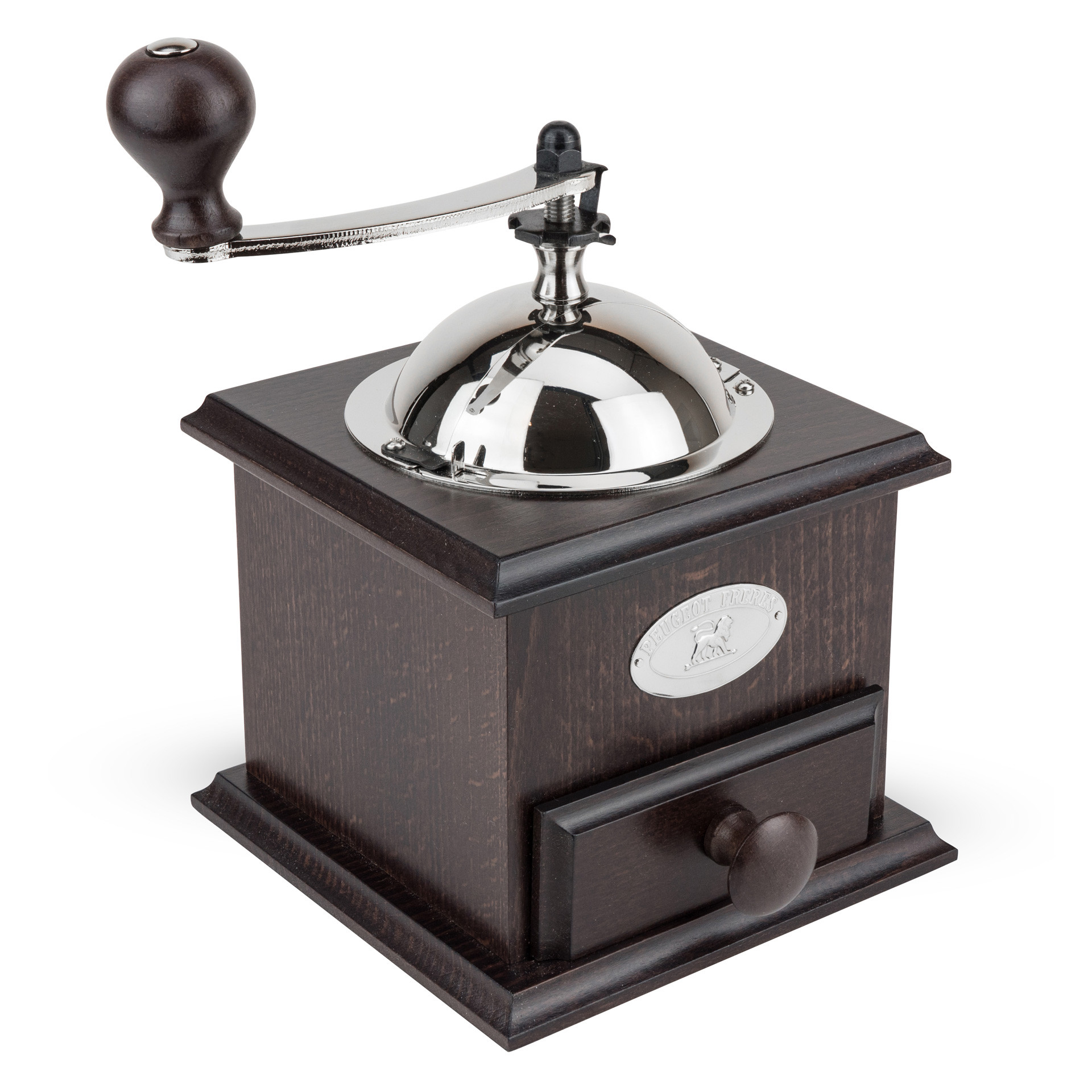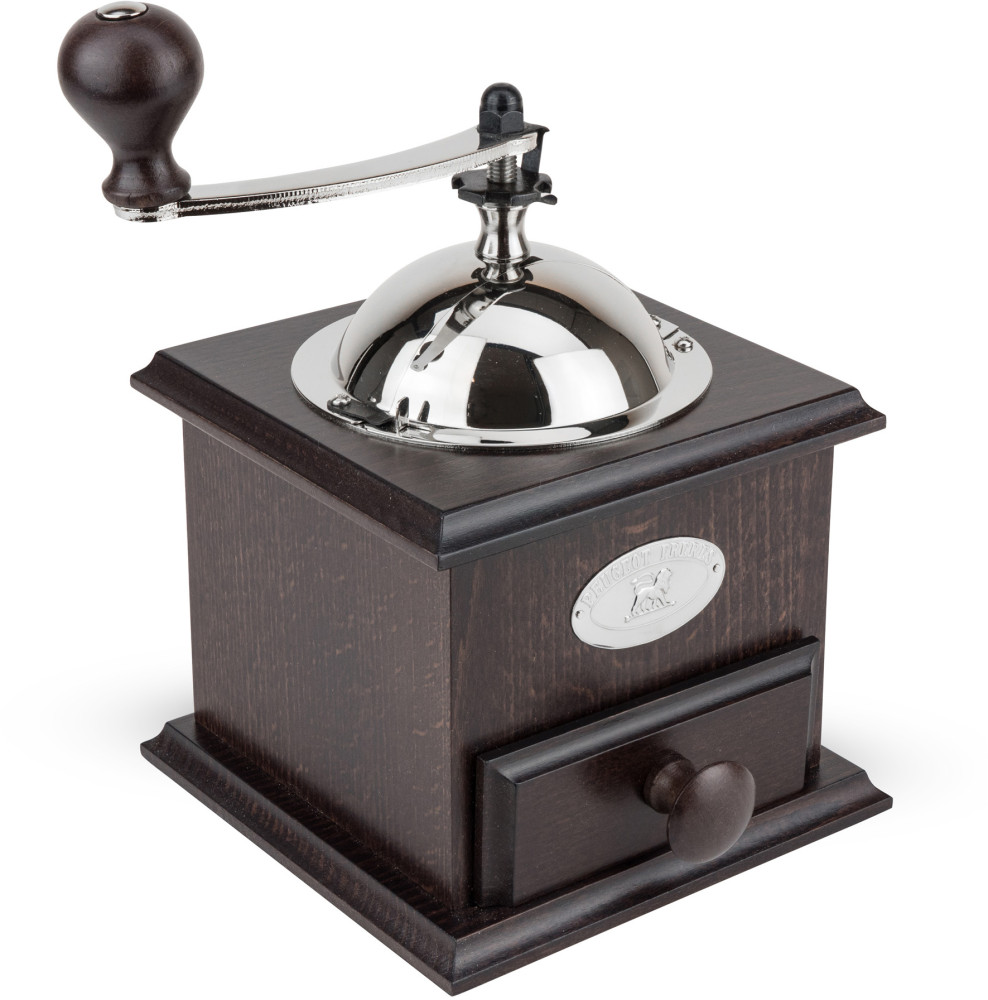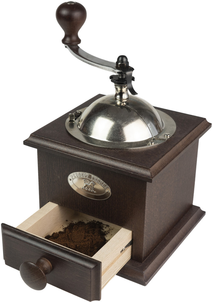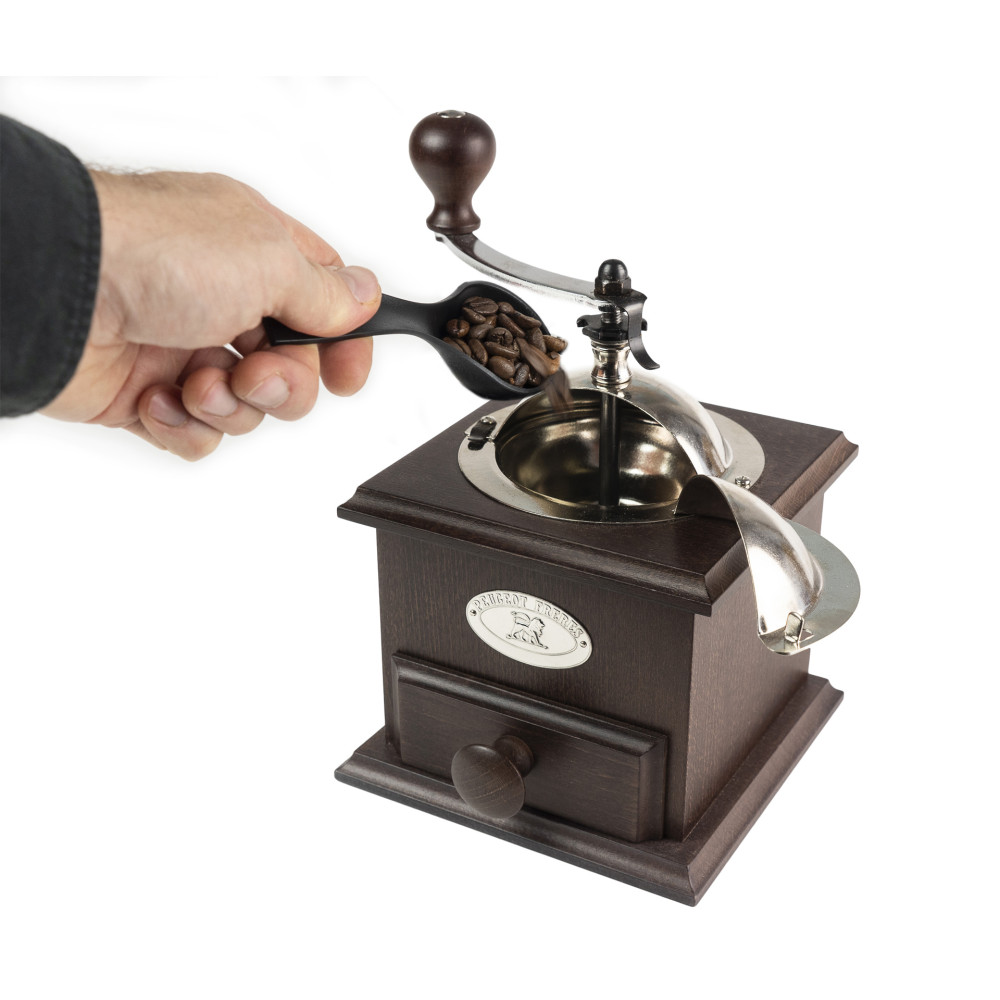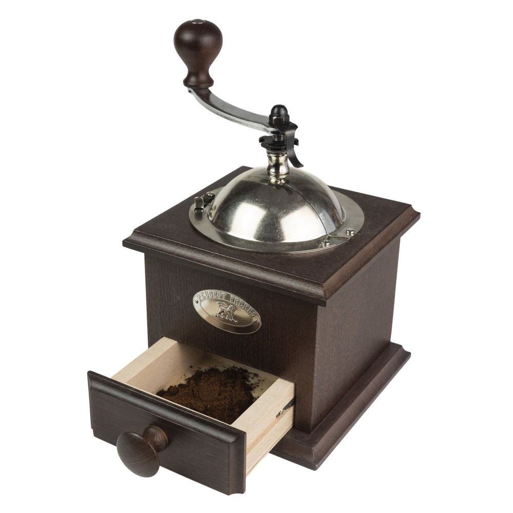 Drewniana, sześcienna obudowa wykonana z drewna bukowego, jest niezwykle stabilna i wygodna podczas mielenia. Zamykany zbiornik na kawę w górnej części młynka, wykonany jest ze stali nierdzewnej. Jego wykończenie w wysokim połysku nadaje młynkowi elegancji i podkreśla jego klasyczny design. Napełnianie młynka ziarnami kawy jest niezwykle wygodne i łatwe, a zasuwka zabezpiecza przed wypadaniem ziaren kawy podczas mielenia. Stalowa korba służąca do napędzania młynka jest w doskonałych proporcjach, a jej obłe, duże i efektowne wykończenie z drewna bukowego sprawia, że wygodnie się ją trzyma i wprowadza w ruch. Szufladka umożliwia zbieranie świeżo zmielonej kawy. Jej otwieranie i zamykanie są łatwe i płynne. Drewniany uchwyt oraz emblemat z symbolem Lwa – znakiem firmowym marki Peugeot - nadaje całości szyku i wysublimowania. Regulacja stopnia mielenia (mniej lub bardziej drobnego w zależności od pożądanego rodzaju kawy) odbywa się za pomocą pokrętła znajdującego się pod korbką.
