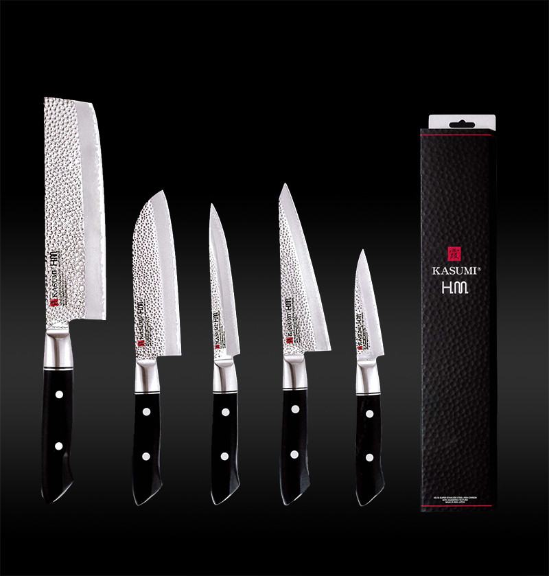 Noże linii HM są produkowane z kobaltowej stali wysokowęglowej dedykowanej do wyrobu noży najwyższej jakości. Ostrze utwardzone jest do poziomu 59-60 w skali Rockwella dzięki czemu idelanie nadaje się do profesjonalnych zastosowań. Efekt młotkowania jest wynikiem kucia na gorąco o nacisku 300 ton co dodatkowo podnosi wytrzymałość stali. Unikalny, oryginalny wzór młotkowania sprawia również, że krojone produkty nie przywierają do boków ostrza. Rękojeść z żywicy poliacetalowej jest higieniczna, wytrzymała i wygodnie leży w ręce.