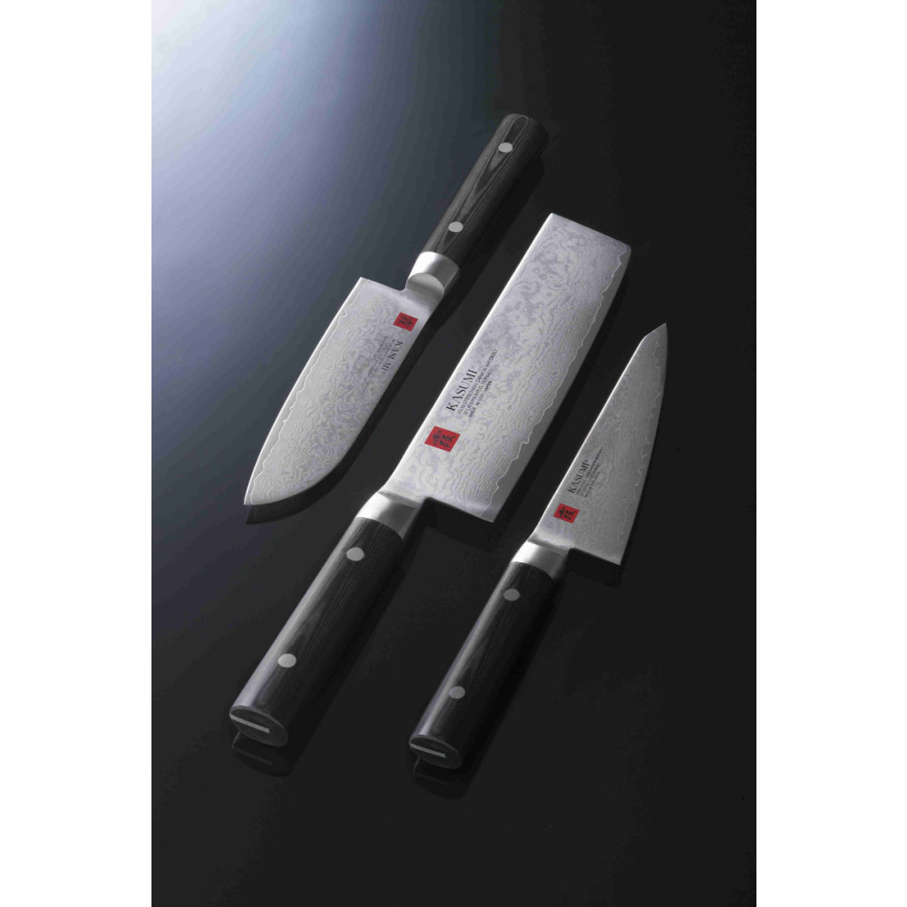 Noże ze stali damasceńskiej są wykonywane zgodnie z kunsztem wytwarzania noży pięlegnowanym od 25-pokoleń przez mistrzów KASUMI.