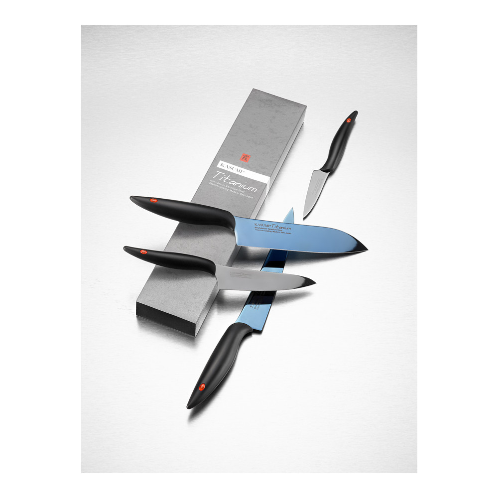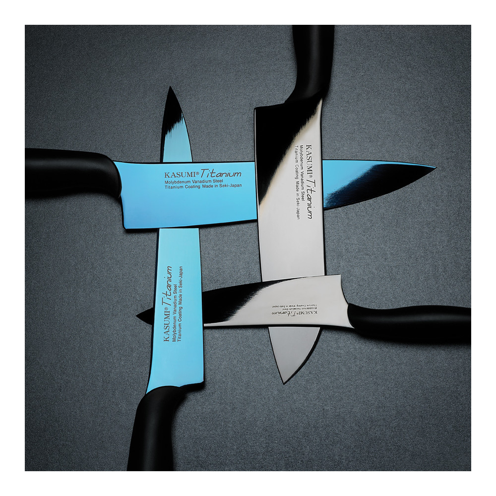 Noże TITANIUM to seria najwyższej jakości noży powlekanych tytanem japońskiej firmy KASUMI.Ostrze wykonane ze stali molibdenowo-wanadowej powlekane warstwą tytanu gwarantuje najwyższą ostrość. Powłoka tytanowa dostępna jest w dwóch kolorach. Tytan jest metalem nietoksycznym a dzięki właściwości nie generowania jonów żelaza na powierzchni, krojona żywność pozbawiona jest metalicznego posmaku. Tytan jest odporny na korozję, i na ścieranie dzięki czemu noże Titanium są niezastąpionymi narzędziami w profesjonalnej kuchni. Ponadto wybór jednej z trzech wersji kolorystycznych - srebrnej, złotej bądź niebieskiej - czyni je dodatkowo stylowym elementem wystroju wnętrza.