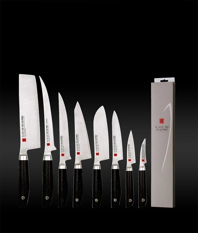Ostrze tnące KASUMI VG-10 PRO jest wykonane z japońskiej monolitycznej wysokowęglowej nierdzewnej stali ze stopu o znacznej zawartości kobaltu. W procesie utwardzania osiągnięto idealną dla profesjonalnych zastosowań kuchennych twardość na poziomie 59-60 stopni w skali Rockwell'a. Technologia produkcji gwarantuje poziom ostrości przewyższającą większość dostępnych na rynku noży. Stal VG-10 PRO zapewnia elastyczność ostrza i odporność na pękanie.