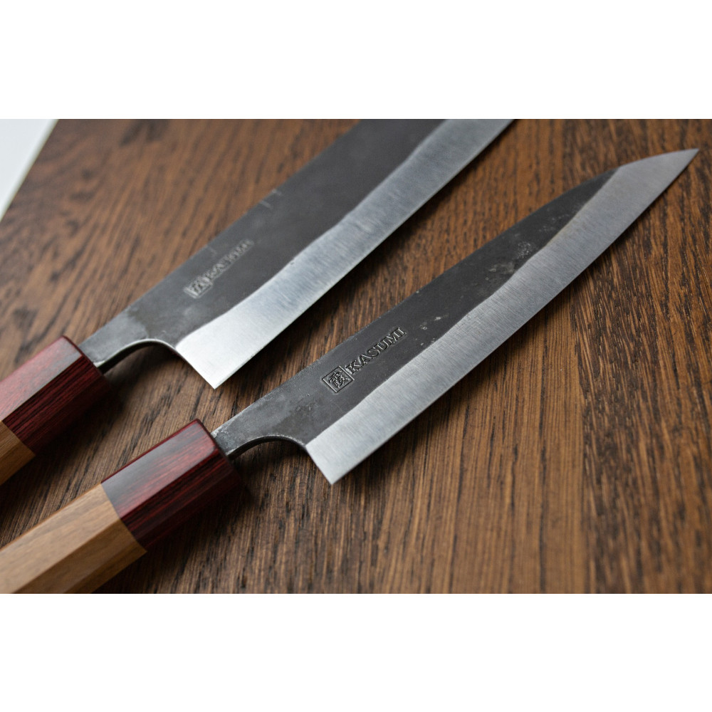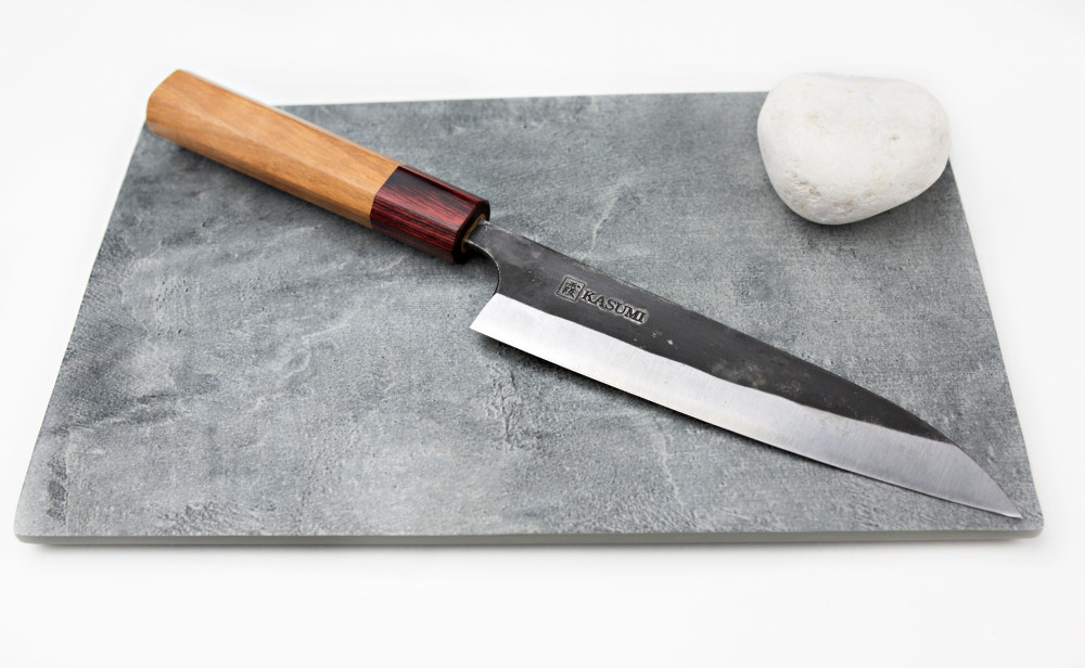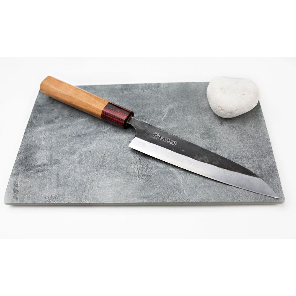 Rzemieślniczo kute noże Kasumi Black Hammer, produkowane w limitowanych ilościach. Wykonane są ze stali Aogami /Blue Paper Steel - tradycyjnej japońskiej stali węglowej, wzbogaconej chromem i wolframem (62 HRC). Noże Black Forged wymagają konserwacji i kontrolowanego użytkowania. Nie posiadają właściwości nierdzewnych. Rękojeść wykonana jest z drewna wiśni.