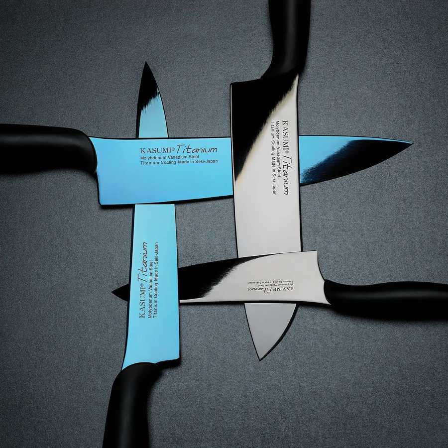 Noże TITANIUM to seria najwyższej jakości noży powlekanych tytanem japońskiej firmy KASUMI.Ostrze wykonane ze stali molibdenowo-wanadowej powlekane warstwą tytanu gwarantuje najwyższą ostrość. Powłoka tytanowa dostępna jest w dwóch kolorach. Tytan jest metalem nietoksycznym a dzięki właściwości nie generowania jonów żelaza na powierzchni, krojona żywność pozbawiona jest metalicznego posmaku. Tytan jest odporny na korozję, i na ścieranie dzięki czemu noże Titanium są niezastąpionymi narzędziami w profesjonalnej kuchni. Ponadto wybór jednej z trzech wersji kolorystycznych - srebrnej, złotej bądź niebieskiej - czyni je dodatkowo stylowym elementem wystroju wnętrza.