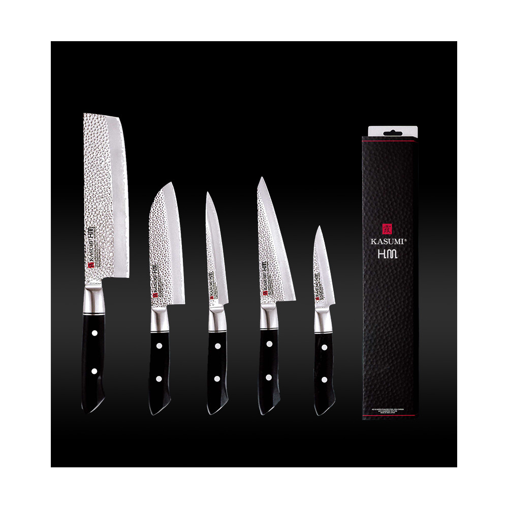 Noże linii HM są produkowane z kobaltowej stali wysokowęglowej dedykowanej do wyrobu noży najwyższej jakości. Ostrze utwardzone jest do poziomu 59-60 w skali Rockwella dzięki czemu idelanie nadaje się do profesjonalnych zastosowań. Efekt młotkowania jest wynikiem kucia na gorąco o nacisku 300 ton co dodatkowo podnosi wytrzymałość stali. Unikalny, oryginalny wzór młotkowania sprawia również, że krojone produkty nie przywierają do boków ostrza. Rękojeść z żywicy poliacetalowej jest higieniczna, wytrzymała i wygodnie leży w ręce.