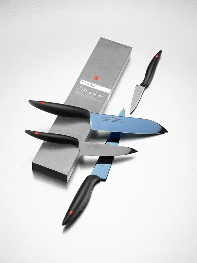 Noże TITANIUM to seria najwyższej jakości noży powlekanych tytanem japońskiej firmy KASUMI.Ostrze wykonane ze stali molibdenowo-wanadowej powlekane warstwą tytanu gwarantuje najwyższą ostrość. Powłoka tytanowa dostępna jest w dwóch kolorach. Tytan jest metalem nietoksycznym a dzięki właściwości nie generowania jonów żelaza na powierzchni, krojona żywność pozbawiona jest metalicznego posmaku. Tytan jest odporny na korozję, i na ścieranie dzięki czemu noże Titanium są niezastąpionymi narzędziami w profesjonalnej kuchni. Ponadto wybór jednej z trzech wersji kolorystycznych - srebrnej, złotej bądź niebieskiej - czyni je dodatkowo stylowym elementem wystroju wnętrza.