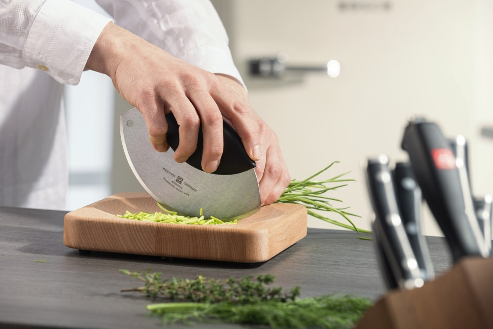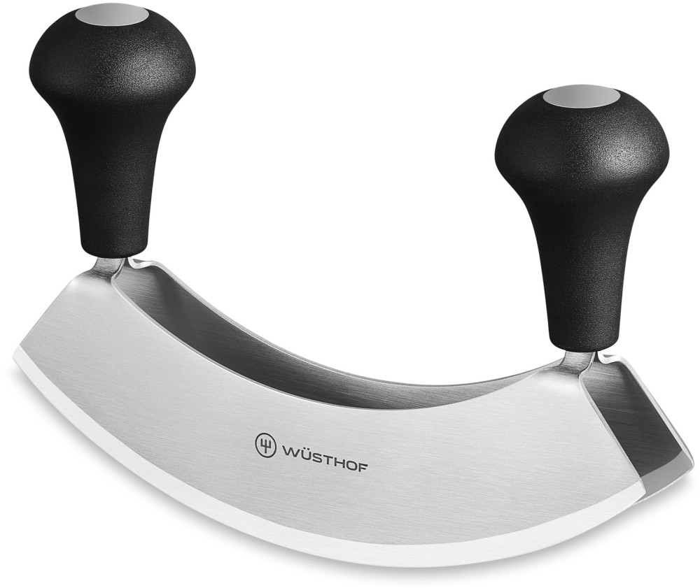 Nóż kolebkowy o podwójnym stalowym ostrzu o długości 18 cm sprawnie i łatwo posieka każdą ilość świeżych ziół. Dzięki syntetycznej rączce jest łatwy do utrzymania w czystości. Nadaje się do mysica w zmywarkach.