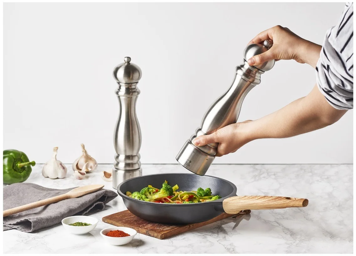 Wykonany ze stali nierdzewnej (stal nierdzewna 304L o wysokiej wytrzymałości i trwałości), ten stylowy i funkcjonalny młynek spełnia oczekiwania najbardziej wymagających użytkowników i sprawdzi się nawet w najtrudniejszych warunkach. Jego korpus jest odporny na zarysowania, uszkodzenia, zmianę temperatur i użycie w wilgotnych warunkach (para). Jego ergonomiczny kształt sprawia, że jest niezwykle wygodny w użyciu. Równie piękny, jak funkcjonalny stanie się jednym z nieocenionych sprzymierzeńców Twojej kuchni.