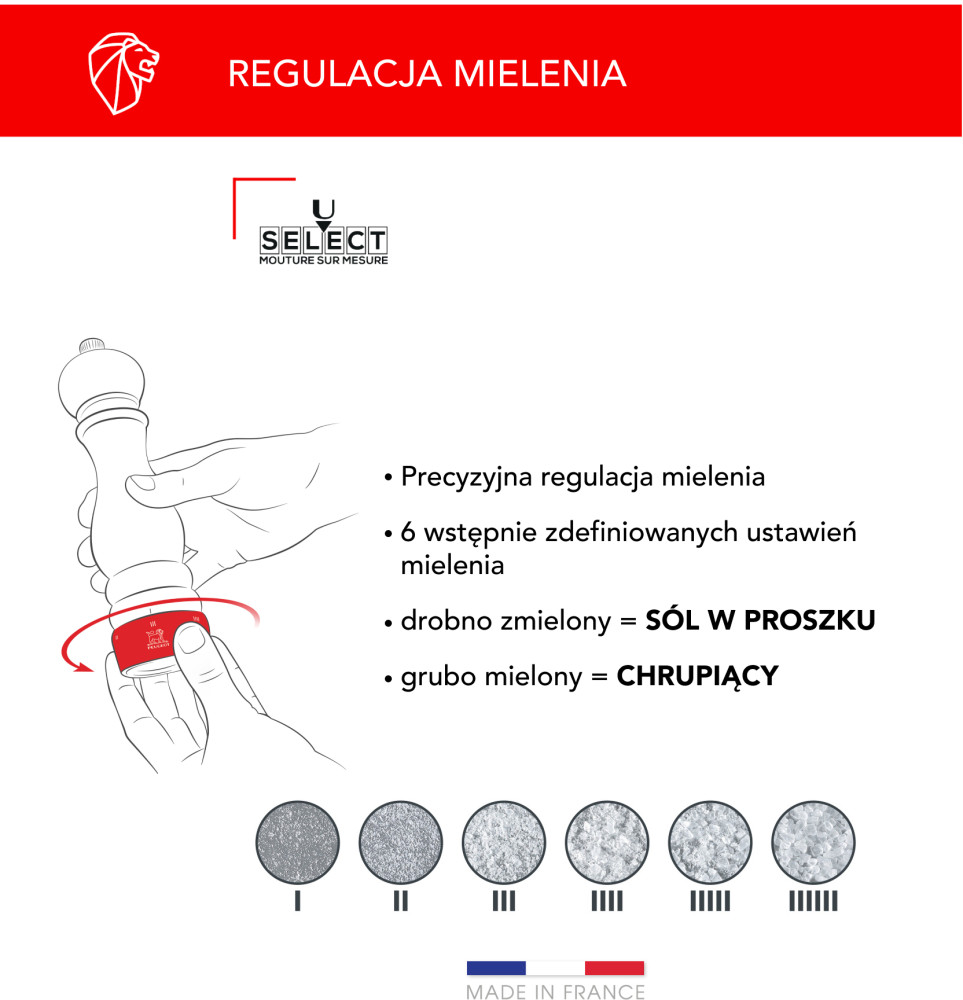 Ustawienie grubości mielenia w młynkach PEUGEOT może odbywać się bądź poprzez tradycyjną płynną regulację dzięki dokręceniu pokrętła w górnej części korpusu, bądź w przypadku młynków z mechanizmem u’Select, przez wybór jednego z 6 stopni grubości mielenia (1 dla najdrobniejszego, 6 dla najgrubszego).