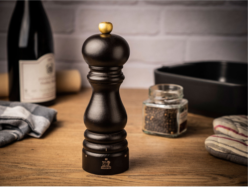 Młynek Peugeot Paris o kultowym kształcie, któremu nadano nowoczesne wykończenie. Ciemne ubarwienie w kolorze czekolady pięknie łączy się z usłojeniem drewna bukowego i matowym, subtelnym wykończeniem. Jego ergonomiczny kształt sprawia, że jest niezwykle wygodny w użyciu.