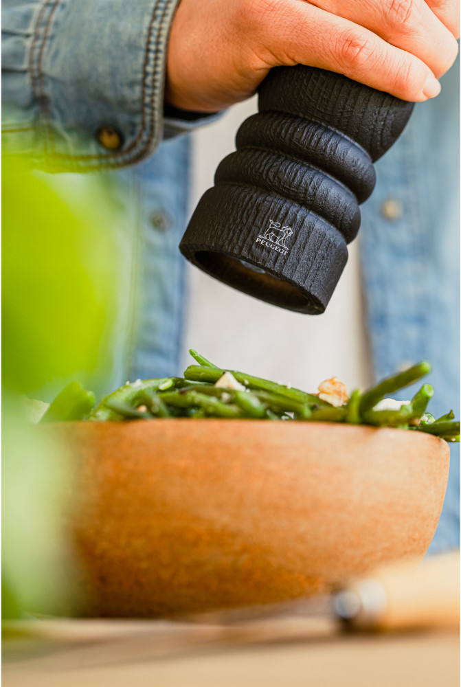 Projektanci firmy PEUEGOT postanowili wykorzystać drewno, które ze względu na pewne niedoskonałości, odrzucane zostało podczas produkcji innych linii młynków. Aby uzyskać niepowtarzalny, naturalny wygląd, który jest charakterystyczny dla młynków PARIS NATURE, drewno nadające się do ponownego użycia, poddaje się teksturowaniu poprzez natryskiwanie drobinkami łupin orzecha włoskiego. Korpus młynka w całości wykonany jest z drewna bukowego pozyskanego z certyfikowanych lasów PEFC™. Wytoczone drewno zabezpieczane jest ekologicznym lakierem pochodzenia roślinnego składającym się z oleju lnianego i wosku Carnauba. W ten oto sposób zachowano naturalny charakter rysunku drewna i zapewniono jego maksymalną trwałość.