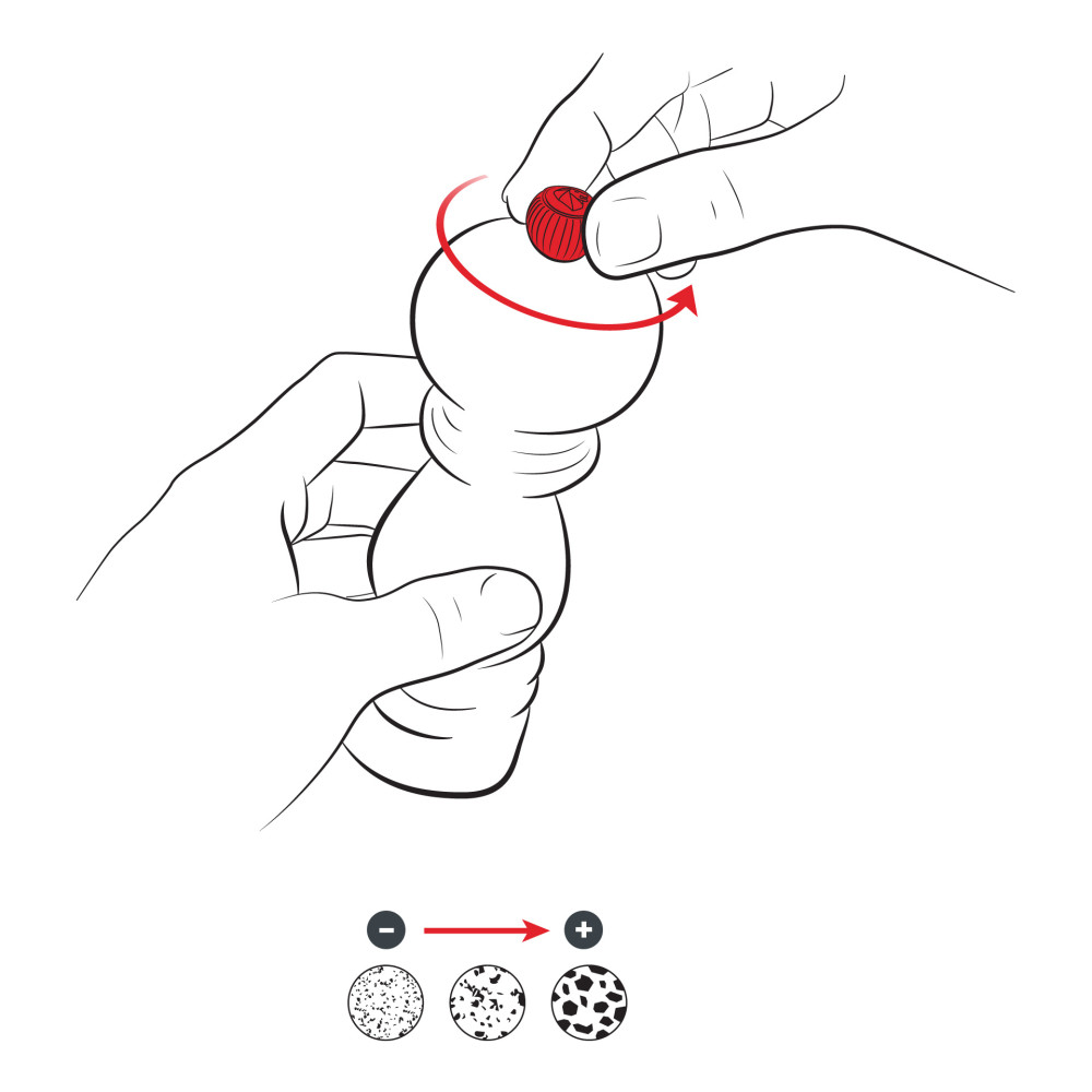 Ustawienie grubości mielenia w młynkach PEUGEOT może odbywać się bądź poprzez tradycyjną płynną regulację dzięki dokręceniu pokrętła w górnej części korpusu, bądź w przypadku młynków z mechanizmem uSelect, przez wybór jednego z 6 stopni grubości mielenia (1 dla najdrobniejszego, 6 dla najgrubszego).