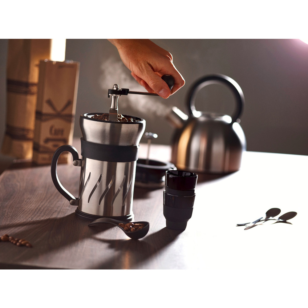 Ten zestaw idealnie sprawdza się również podczas podróżowania. Ciesz się niepowtarzalnym smakiem świeżo zmielonej kawy gdziekolwiek jesteś. Zaparzacz posiada wygodny uchwyt zapewniający pewne trzymanie. Estetyczne połączenie stali nierdzewnej w satynowym wykończeniu z wysokiej jakości tworzywem sztucznym sprawia, że prezentuje się doskonale w różnych aranżacjach wnętrz.