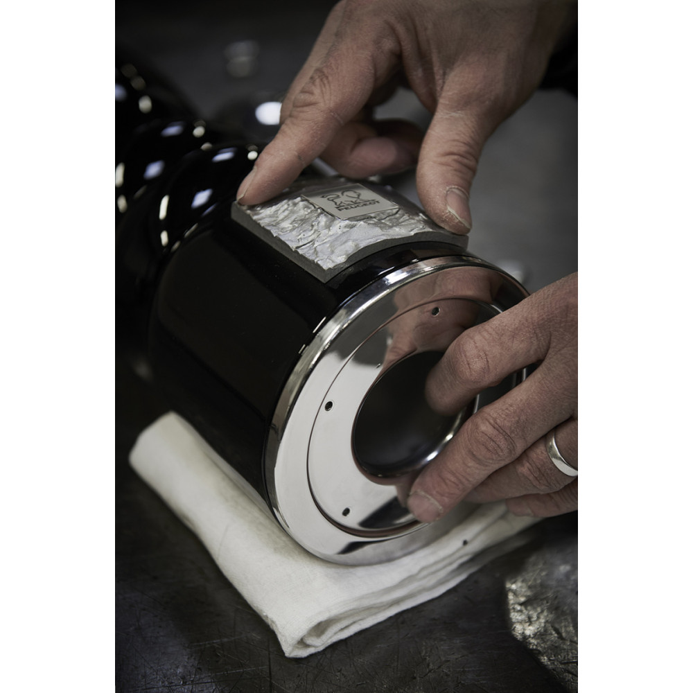 Ustawienie grubości mielenia dokonuje się dzięki dokręceniu pokrętła w górnej części korpusu. Obracając nakrętkę zgodnie z ruchem wskazówek zegara, uzyskasz drobniejsze mielenie, natomiast obracając nakrętkę w przeciwnym kierunku, uzyskasz grubszą gradację. Młynek wyposażony jest w mechanizm mielący najwyższej klasy, co potwierdza dożywotnia gwarancja. Ta limitowana edycja dostarczana jest wraz z certyfikatem autentyczności w drewnianym, ekspozycyjnym pudełku. Metalowy emblemat z logo Peugeot u jego podstawy jest niezwykle atrakcyjnym wizualnie akcentem nawiązującym do dwustuletniej historii firmy Peugeot.