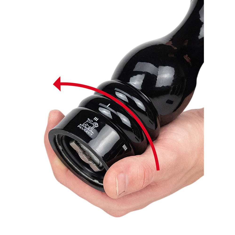 Ustawienie grubości mielenia w młynkach PEUGEOT może odbywać się bądź poprzez tradycyjną płynną regulację dzięki dokręceniu pokrętła w górnej części korpusu, bądź w przypadku młynków z mechanizmem uSelect, przez wybór jednego z 6 stopni grubości mielenia (1 dla najdrobniejszego, 6 dla najgrubszego).
