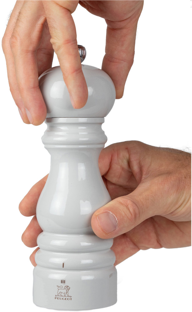 Ustawienie grubości mielenia w młynkach PEUGEOT może odbywać się bądź poprzez tradycyjną płynną regulację dzięki dokręceniu pokrętła w górnej części korpusu, bądź w przypadku młynków z mechanizmem uSelect, przez wybór jednego z 6 stopni grubości mielenia (1 dla najdrobniejszego, 6 dla najgrubszego).