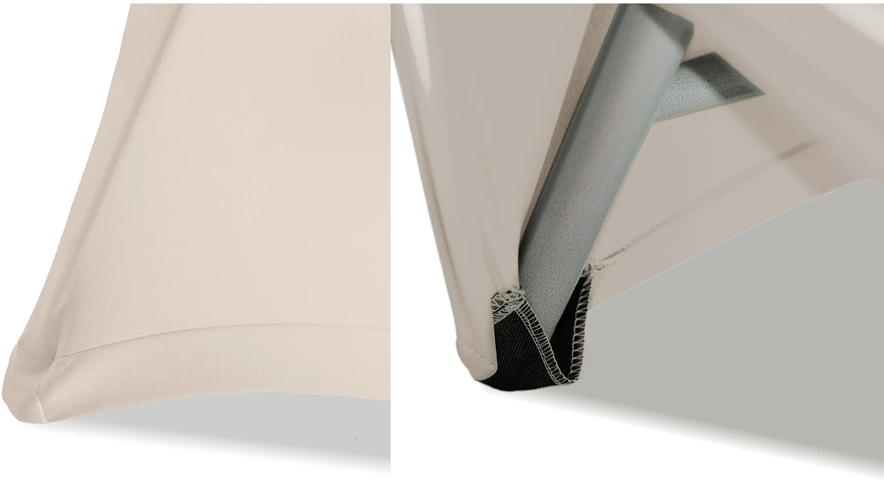 Pokrowce produkowane są w Polsce, z wysokiej jakości dzianiny poliestrowej (96%) z elastanem (4%) o gramaturze 220 g/m². Specjalnie wzmocnione „stopki” pokrowców wykonane z tkaniny odpornej na przetarcia idealnie zakryją nogi stołów i sprawią że pokrowiec będzie optymalnie napięty bez zbędnych marszczeń czy fałd.