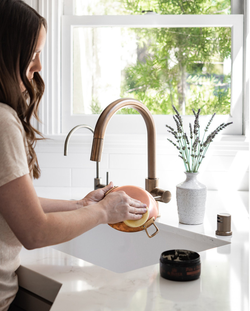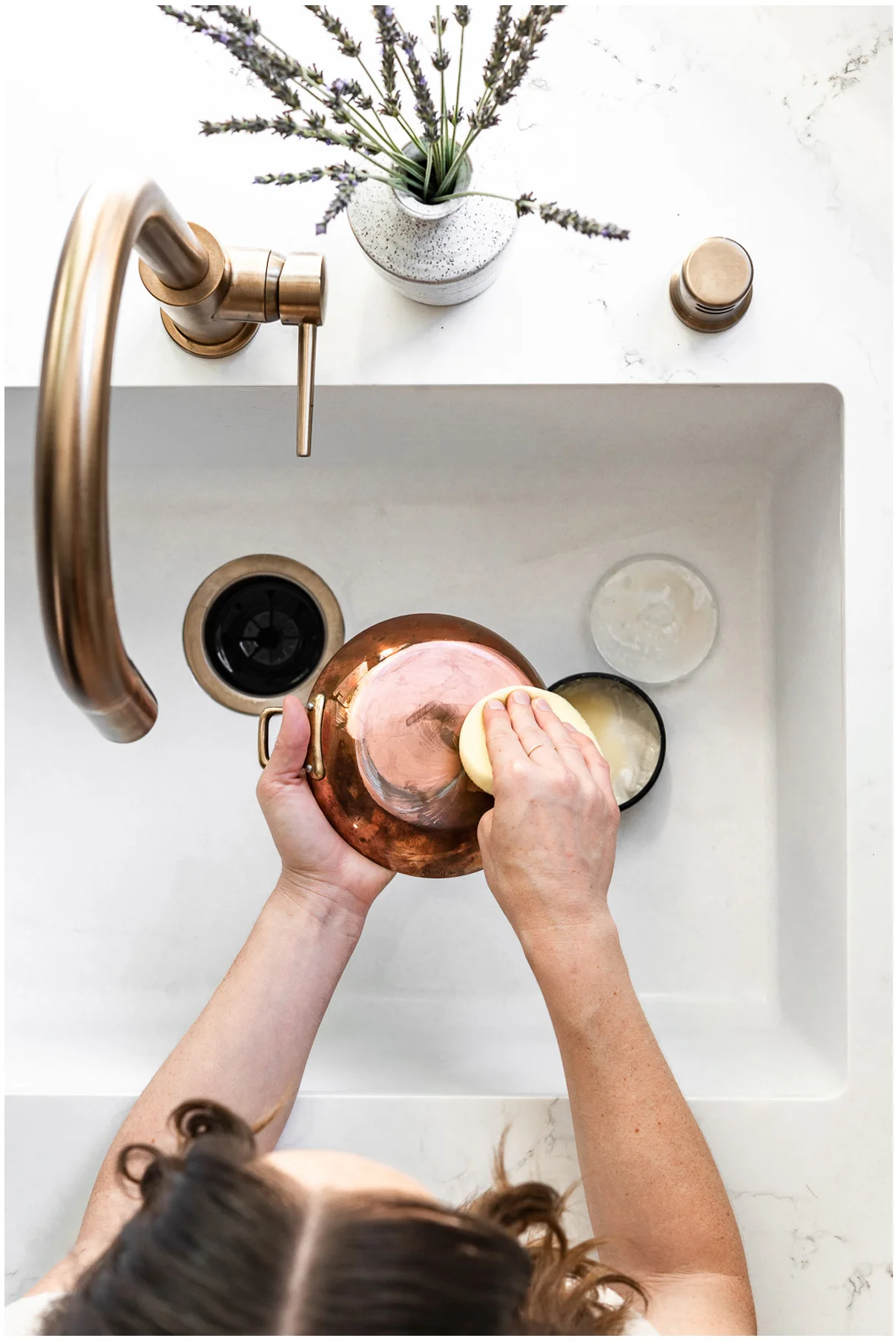 Nietuzinkowy wygląd miedzianych naczyń, z czasem się zmienia. Miedź utlenia się i zmienia barwę – jest to naturalny proces patynowania. Ciepła barwa „brzoskwiniowej miedzi” nabiera z czasem ciemniejszy odcień, co ma swój urok. Jeżeli chcesz zachować jasny odcień miedzi oraz pozbyć się wszelkiego rodzaju zacieków, przebarwień powstałych podczas gotowania, użyj pasty do czyszczenia miedzi marki de Buyer.