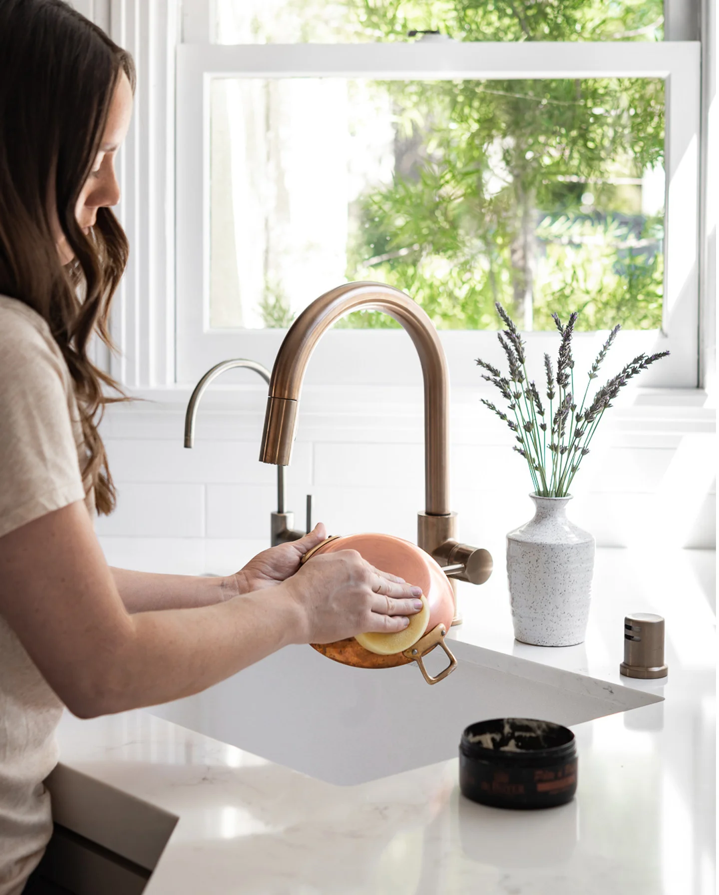 Ta łatwa w użyciu pasta do czyszczenia miedzi szybko przywróci oryginalny połysk, sprawiając, że Twoje naczynia kuchenne będą prezentować się jak nowe. Wystarczy niewielka ilość pasty na miękką gąbkę zwilżoną wodą i okrężne ruchy, aby wcześniej wyczyszczone przybory kuchenne odzyskały swój blask i kolor. Pasta nie tylko przywraca połysk, ale także jest delikatna dla miedzi, gwarantując bezpieczne użytkowanie naczyń. Pomaga w utrzymaniu oryginalnego odcienia miedzi, eliminując zacieki i przebarwienia powstałe podczas gotowania.