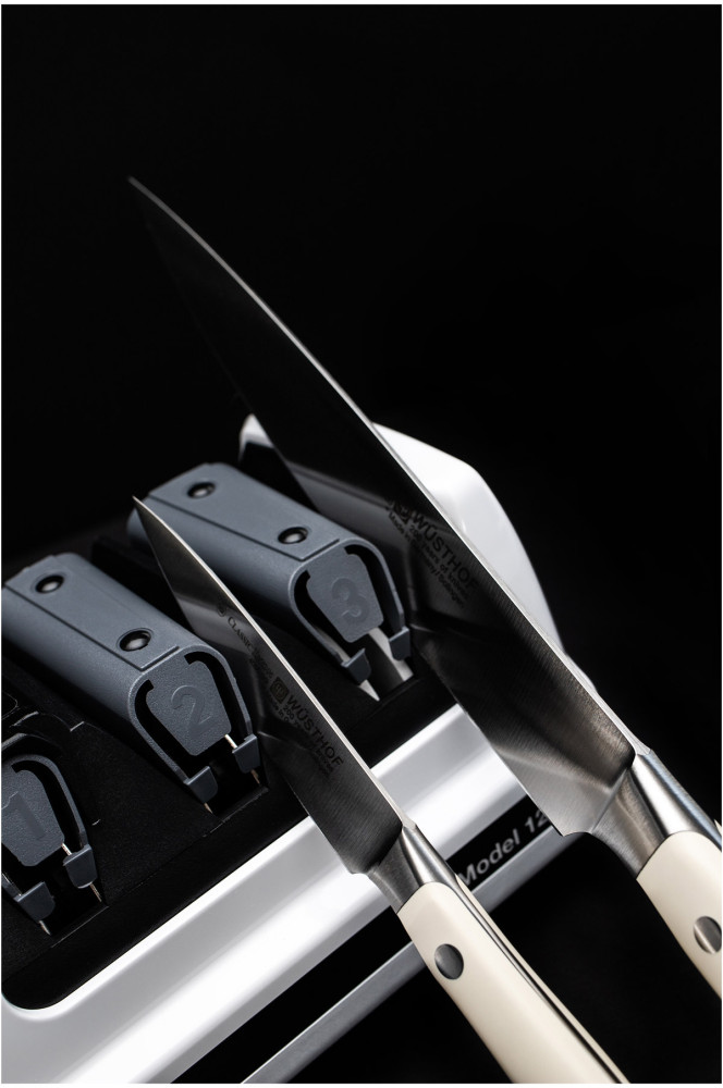 - podostrzanie noża zalecane jest wykonywać w etapie 2 lub 2+3. Technologia TrizorPLus® - potrójna faza, utworzona przez trzy fasety o różnych kątach - daje efekt bardzo ostrego, jednocześnie wzmocnionego, trwalszego ostrza. Ultradrobne ścierne diamentowe dyski w etapie 2 doostrzają agresywniej krawędź noża, a elastomerowe dyski w etapie 3 polerują ostrze do ostrości brzytwy.Zaawansowany system kontroli ustawienia krawędzi noża podczas jego ostrzenia. Do wszystkich rodzajów noży: kucharskich, santoku, tasaków, sportowych i ząbkowanych (tylko etap 3).