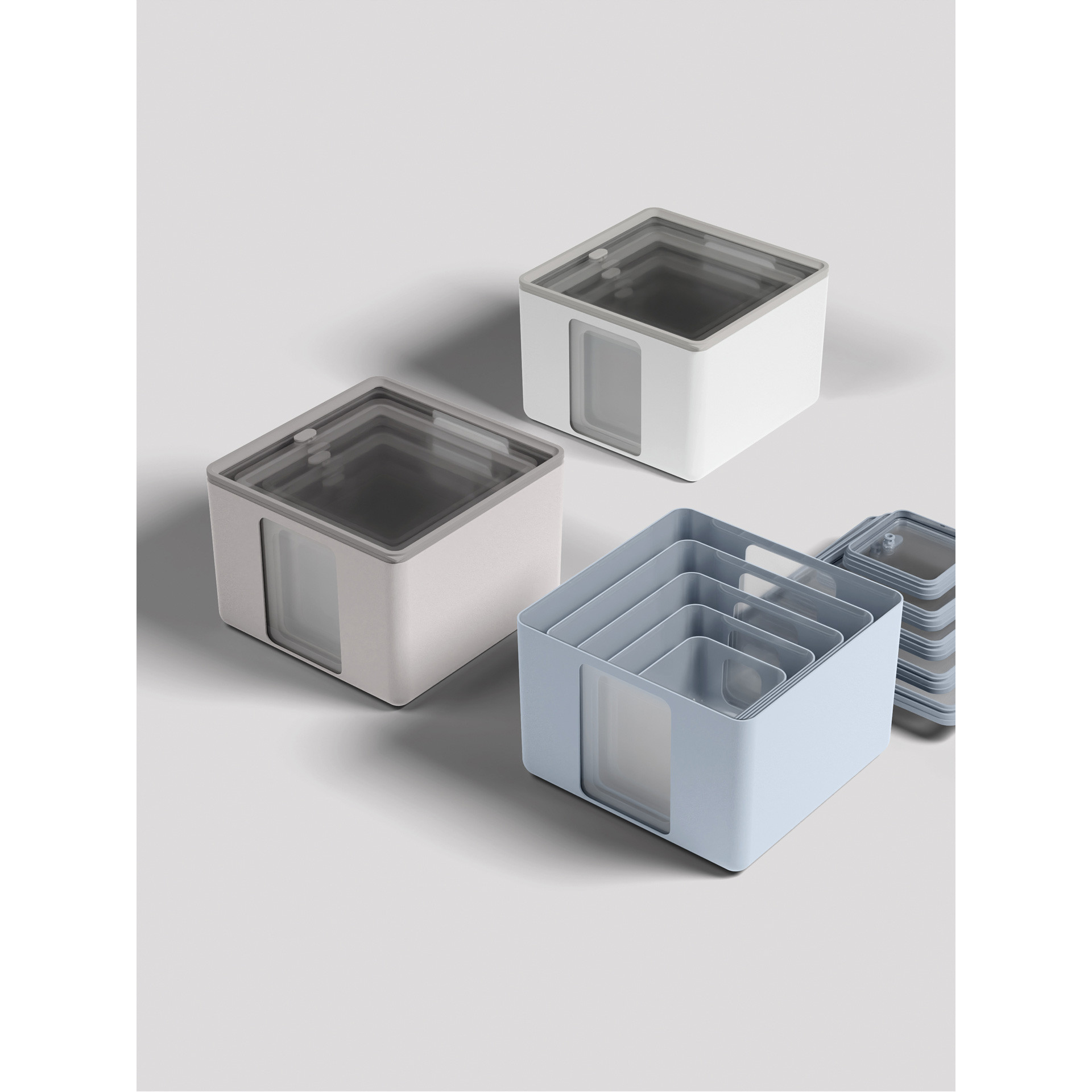 Sześć pastelowych kolorów, można ze sobą łączyć, tworząc ciekawe kompozycje. Okienka boczne oraz przezroczysta pokrywka pozwalają łatwo zobaczyć zawartość. Pojemniki w trzech różnych rozmiarach można wkładać jeden w drugi, co pozwala na efektywne przechowywanie i oszczędność miejsca.