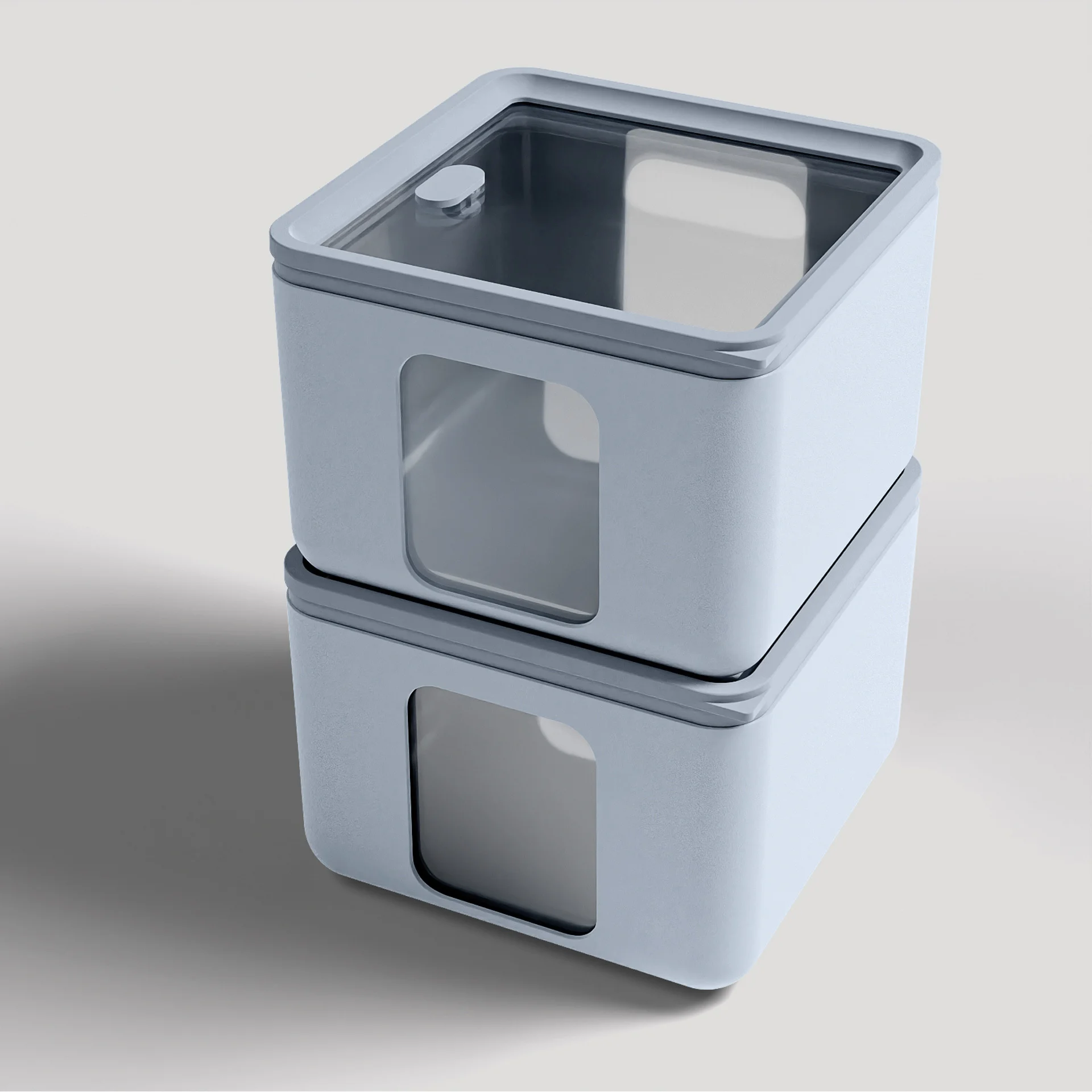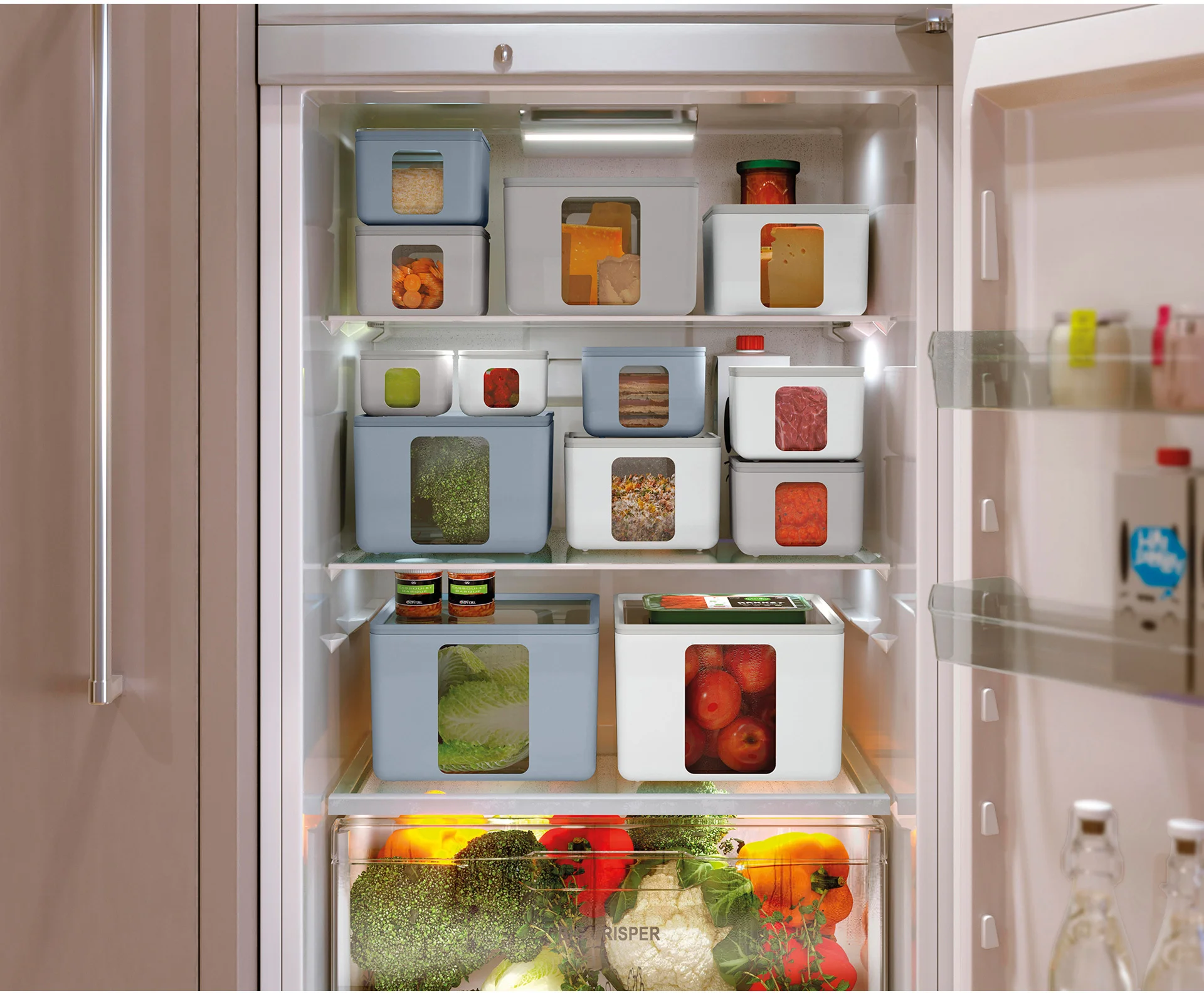 Sześć pastelowych kolorów, można ze sobą łączyć, tworząc ciekawe kompozycje. Okienka boczne oraz przezroczysta pokrywka pozwalają łatwo zobaczyć zawartość. Pojemniki w trzech różnych rozmiarach można wkładać jeden w drugi, co pozwala na efektywne przechowywanie i oszczędność miejsca.