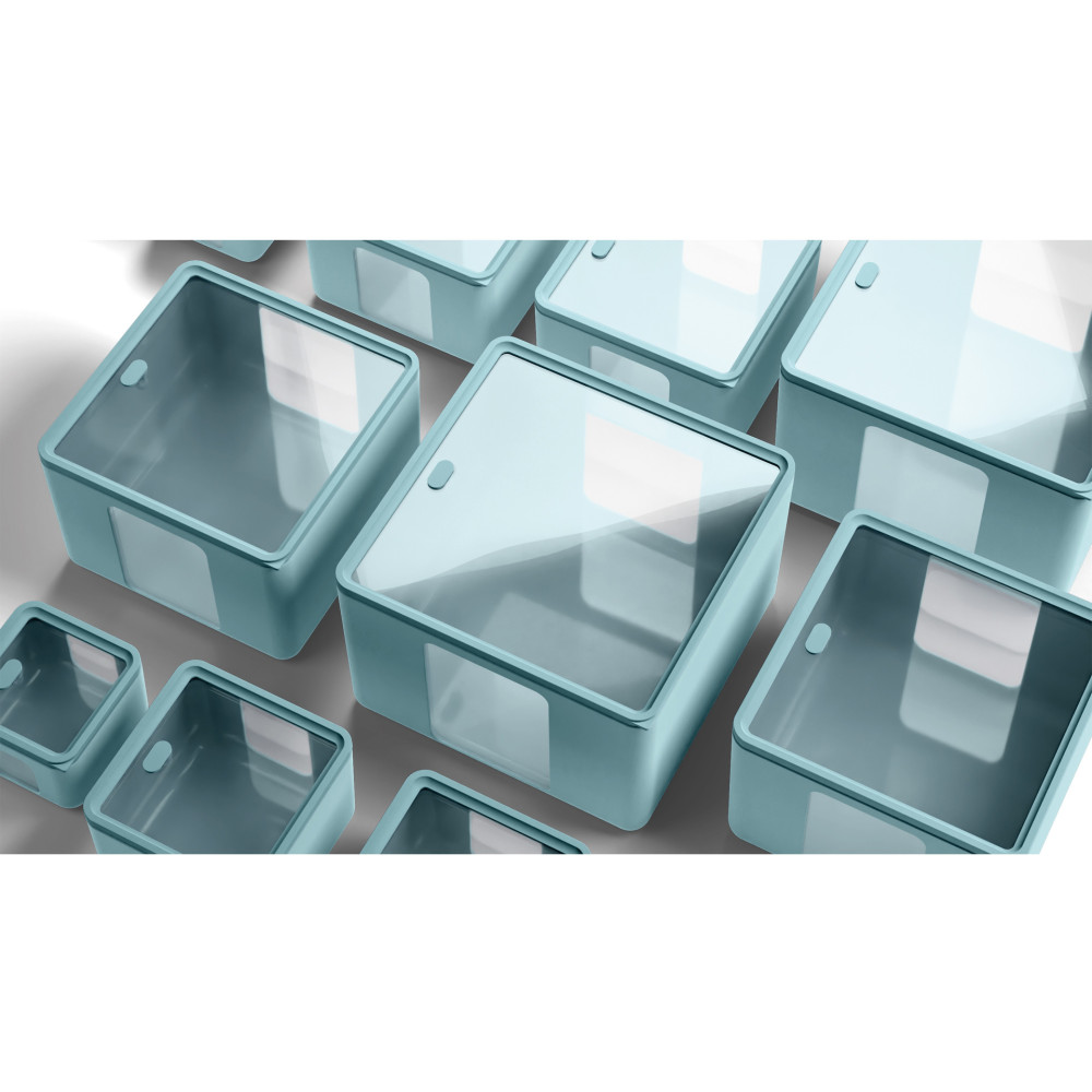 Sześć pastelowych kolorów, można ze sobą łączyć, tworząc ciekawe kompozycje. Okienka boczne oraz przezroczysta pokrywka pozwalają łatwo zobaczyć zawartość. Pojemniki w trzech różnych rozmiarach można wkładać jeden w drugi, co pozwala na efektywne przechowywanie i oszczędność miejsca.