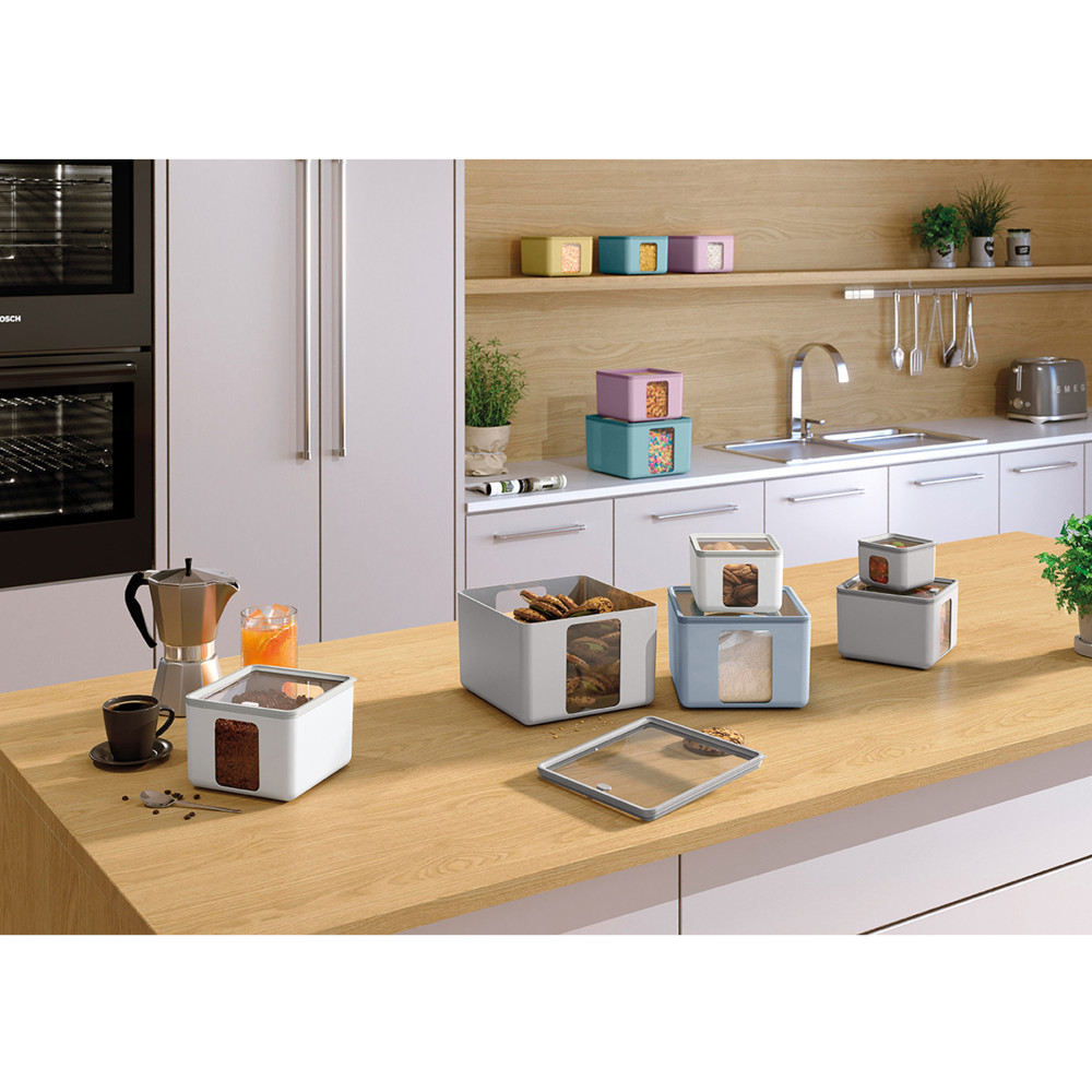 Sześć pastelowych kolorów, można ze sobą łączyć, tworząc ciekawe kompozycje. Okienka boczne oraz przezroczysta pokrywka pozwalają łatwo zobaczyć zawartość. Pojemniki w trzech różnych rozmiarach można wkładać jeden w drugi, co pozwala na efektywne przechowywanie i oszczędność miejsca.