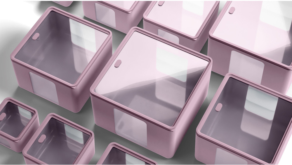 Zestaw pojemników dostępny jest w sześciu pastelowych kolorach, które można ze sobą łączyć, tworząc ciekawe kompozycje. Okienka boczne oraz przezroczysta pokrywka pozwalają łatwo zobaczyć zawartość. Pojemniki w trzech różnych rozmiarach można wkładać jeden w drugi, co pozwala na efektywne przechowywanie i oszczędność miejsca.